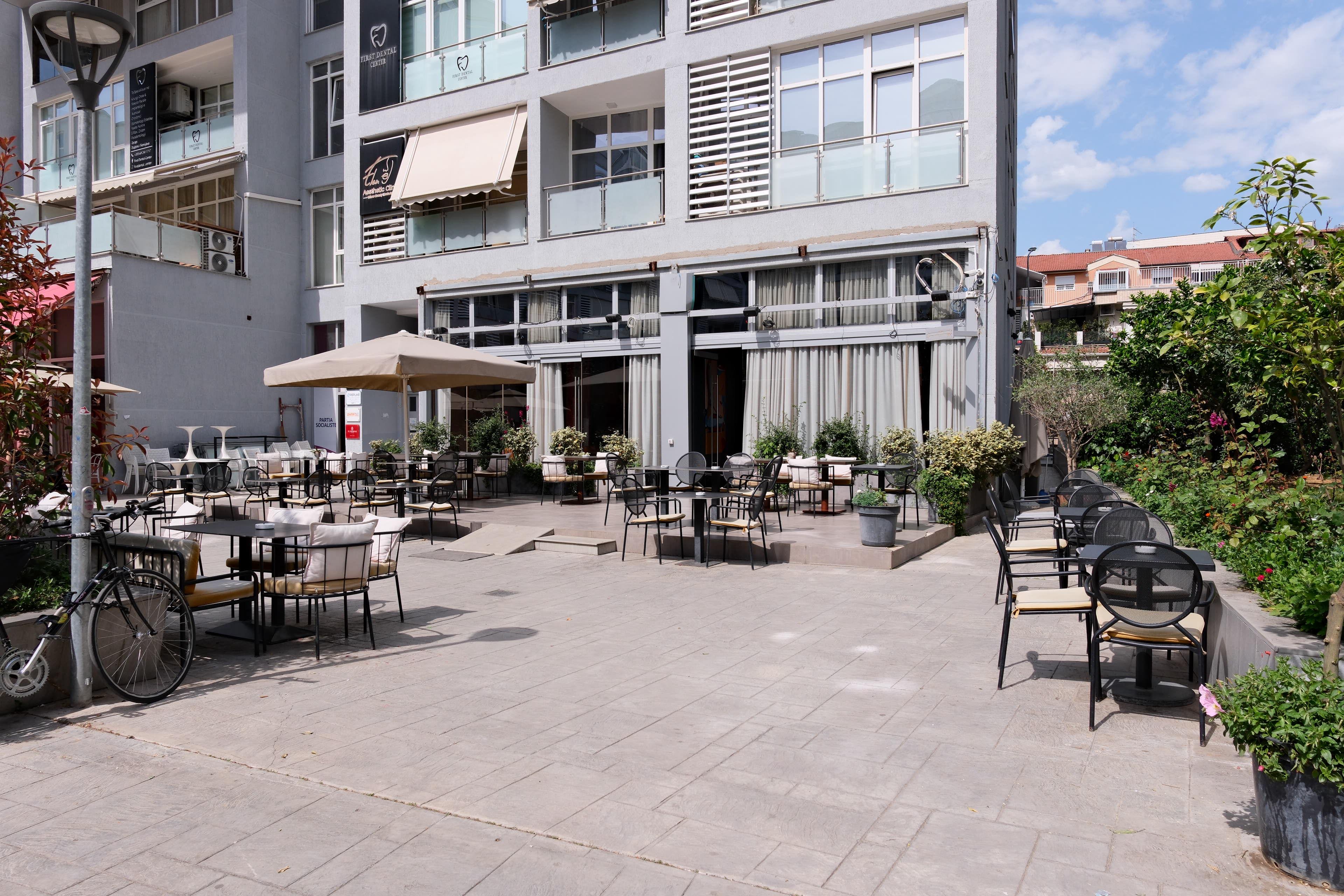 transform this modern outdoor caf patio into an elegant mediterranean spanish terrace add a large fabric awning fixed to the glass fa ade with bold red and white vertical stripes slightly soft and naturally draped place multiple refined red umbrellas with subtle white embroidered trim evenly spaced across the seating area replace all existing furniture with black metal frame chairs featuring warm wood accents styled with red and white striped cushions introduce small round caf tables with slim dark metal bases and light natural stone or wood tabletops upgrade the flooring to textured natural stone tiles in warm grey beige tones slightly irregular and aged for an authentic spanish feel add terracotta pots with lush greenery mediterranean plants and subtle climbing vines along the fa ade maintain a balanced uncluttered layout lighting soft warm mediterranean sunlight 2800 3000k gentle shadows realistic materials high end architectural visualization ultra detailed photorealistic 4k refined and cozy atmosphere global illumination soft shadows physically accurate materials v ray style render