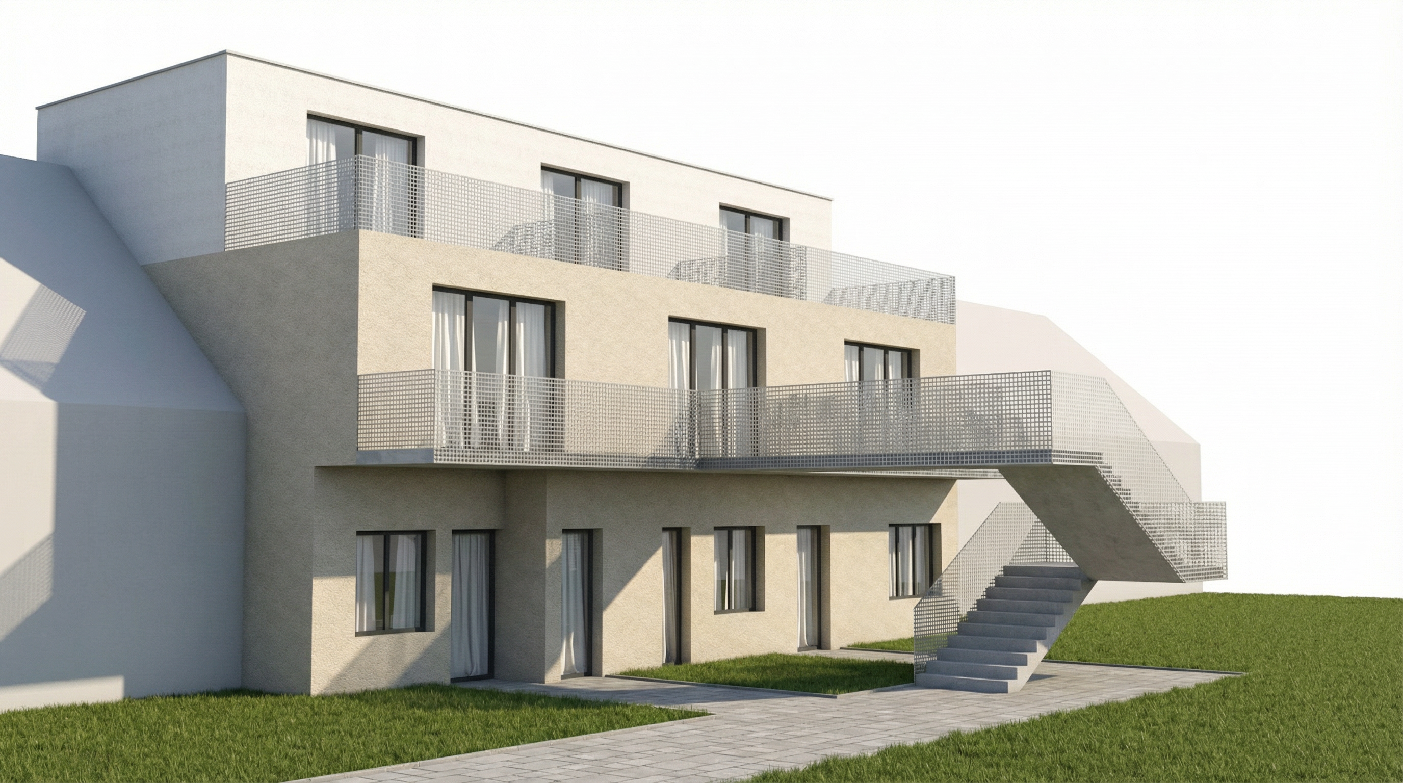 insert white curtians to windows from interior add pavement and better looking grass