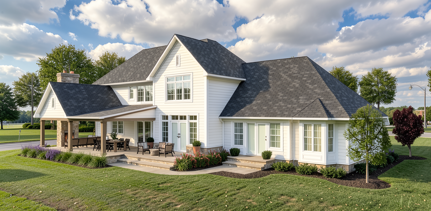 interior shot add a custom built in corner bunk bed identical in style to the reference image twin over twin configuration with floor to ceiling square columns horizontal beams and integrated trim soft warm white painted millwork with clean shaker detailing upper bunk with vertical slat guard rail and flat wood cap rail lower bunk recessed with two integrated drawers and a pull out trundle bed beneath architectural permanently built in appearance not furniture accurate scale realistic proportions photorealistic interior rendering keep all existing room elements unchanged walls ceiling window lighting floor