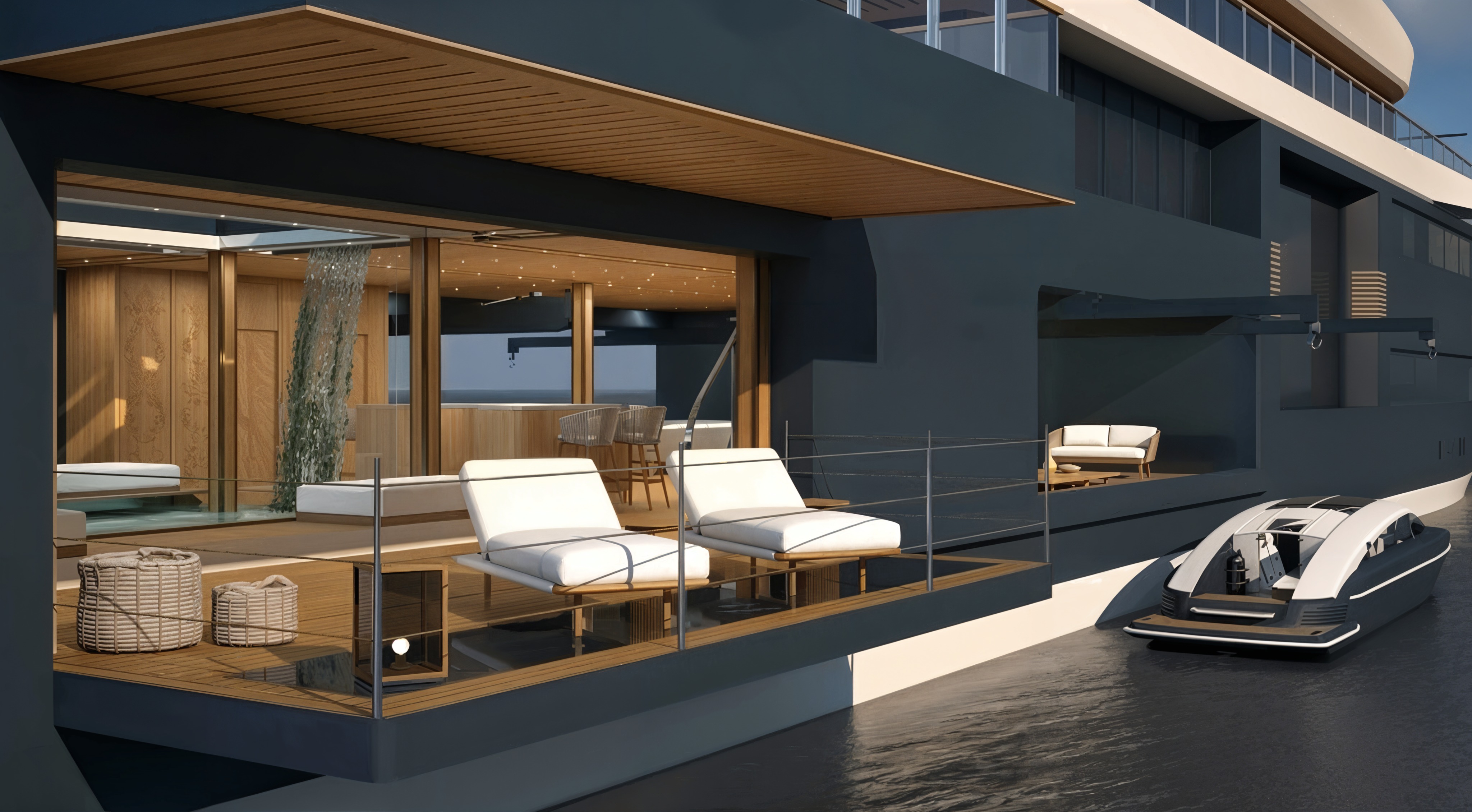 remove exclusively the left woven basket located on the lowered platform in the foreground do not modify the right basket decking glazing railings furniture cushions ceiling columns lighting yacht exterior water camera position perspective colors of any other element in place of the removed left basket insert a minimalist potted bamboo plant specifications elegant contemporary bamboo slender vertical stems natural green leaves refined and not overly dense balanced height slightly higher than the basket but below railing height matte cylindrical planter neutral tone warm light beige sand or soft taupe no decorative patterns on the planter clean architectural aesthetic the bamboo must feel integrated with the tropical luxury yacht environment subtle and refined maintain global lighting shadows and realism exactly as in the original render the potted plant must be small and minimal