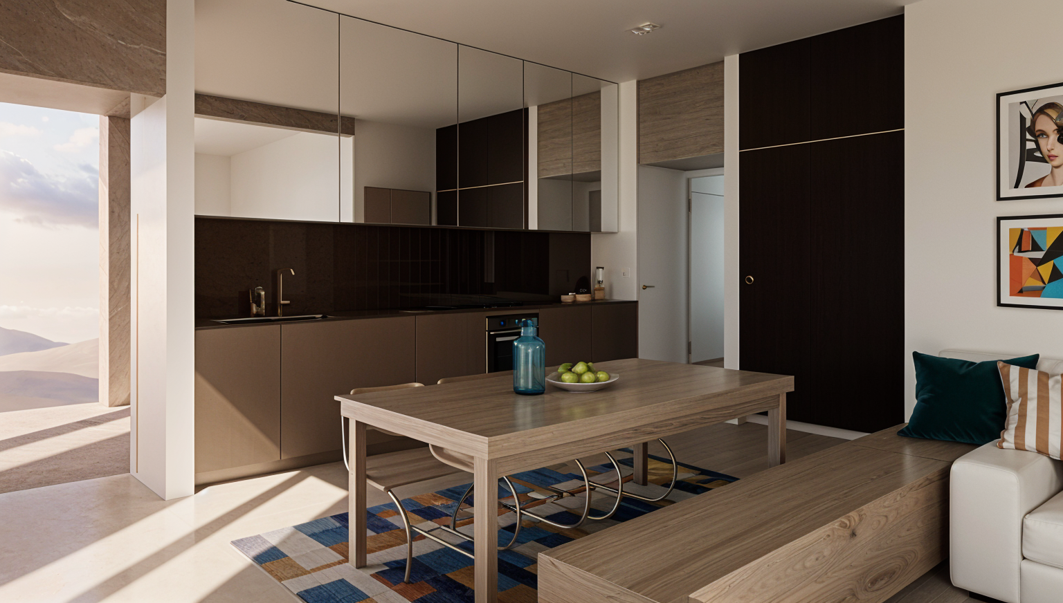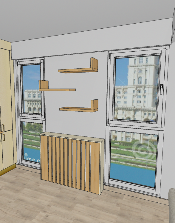 create a bright and modern interior space with large windows showcasing a vibrant cityscape render the walls in a sleek pale gray tone design elegant minimalist floating shelves in a natural light oak finish the radiator cover should have a refined vertically slatted wooden appearance matching the shelves in color the window frames should be crisp white enhancing the abundant natural light the floor should be a soft muted light wood complementing the overall airy atmosphere capture a warm welcoming ambiance with diffused daylight softly illuminating the room