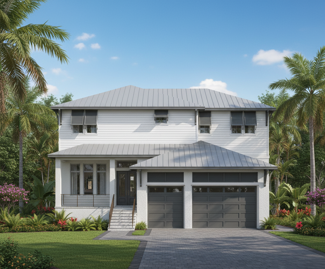 commercial dockside building where customers pick up snorkel equipment building is in a tropical setting next to concrete dock dock is in background foreground is grass and paths building is pale yellow and roof is light color metal add palm trees