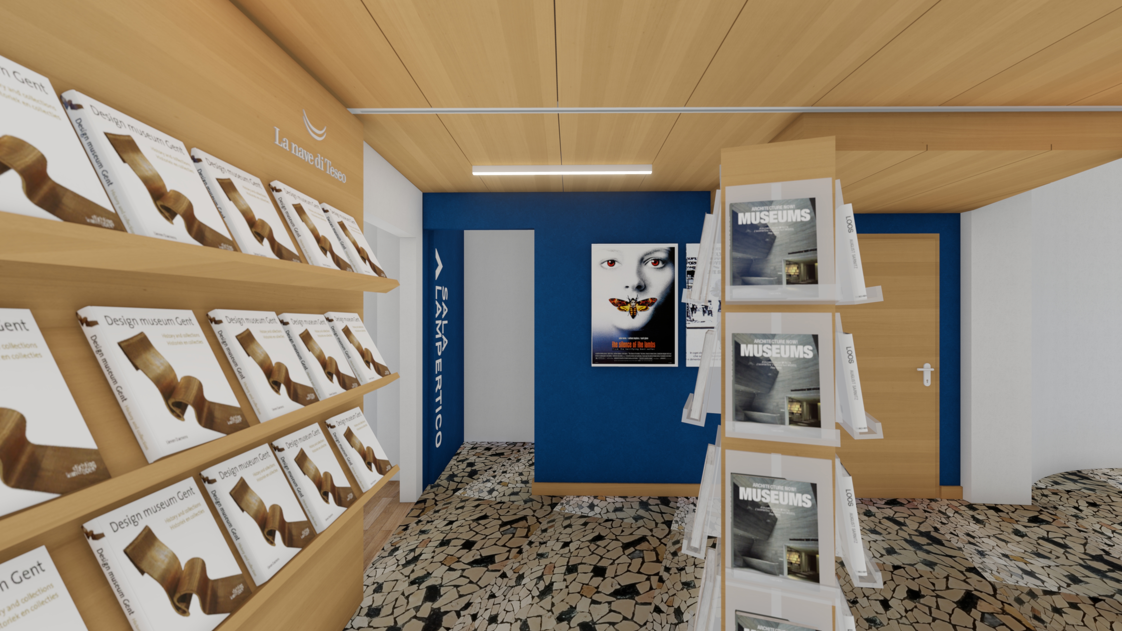 interno di un book shop con luci soffuse non troppo forti no illuminazione naturale pareti e controsoffitto rivestite con pannelli in legno chiaro non lucidi non aggiungere geometrie e non modificare textures