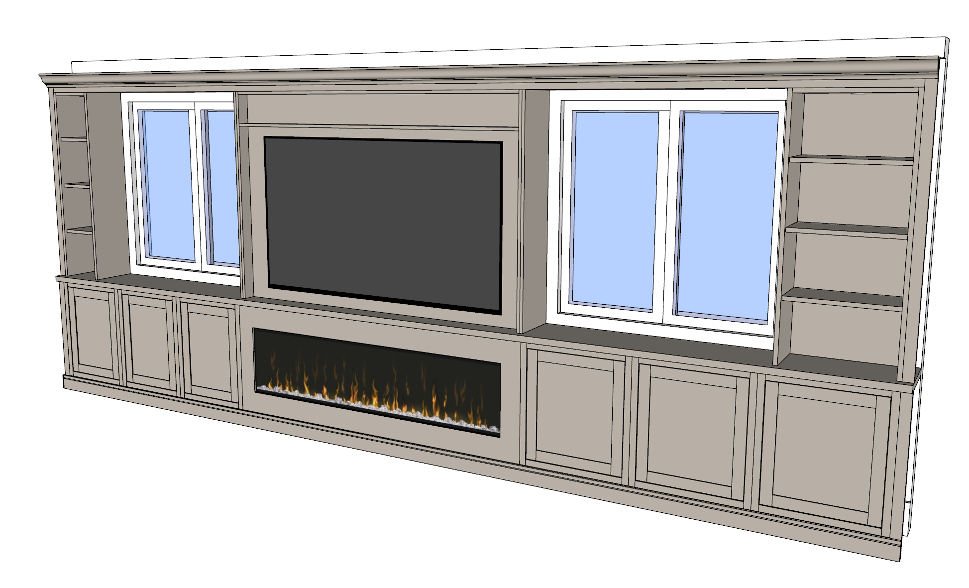 create a photorealistic render of the image keeping the colours used exactly the same add led lighting to the existing spotlights in the outer upper section cabinets to the centre of each individual shelf add in a carpetted floor and skirting along the side walls too