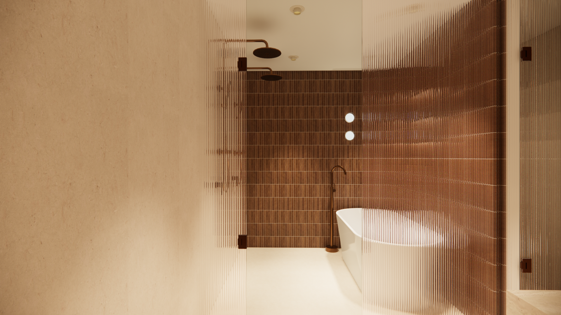 make this a photorealistic render make the lighting better and seem very calming only add a small timber bath stool only the stool and thats it do not add a vanity or anything pt some small items on the stool