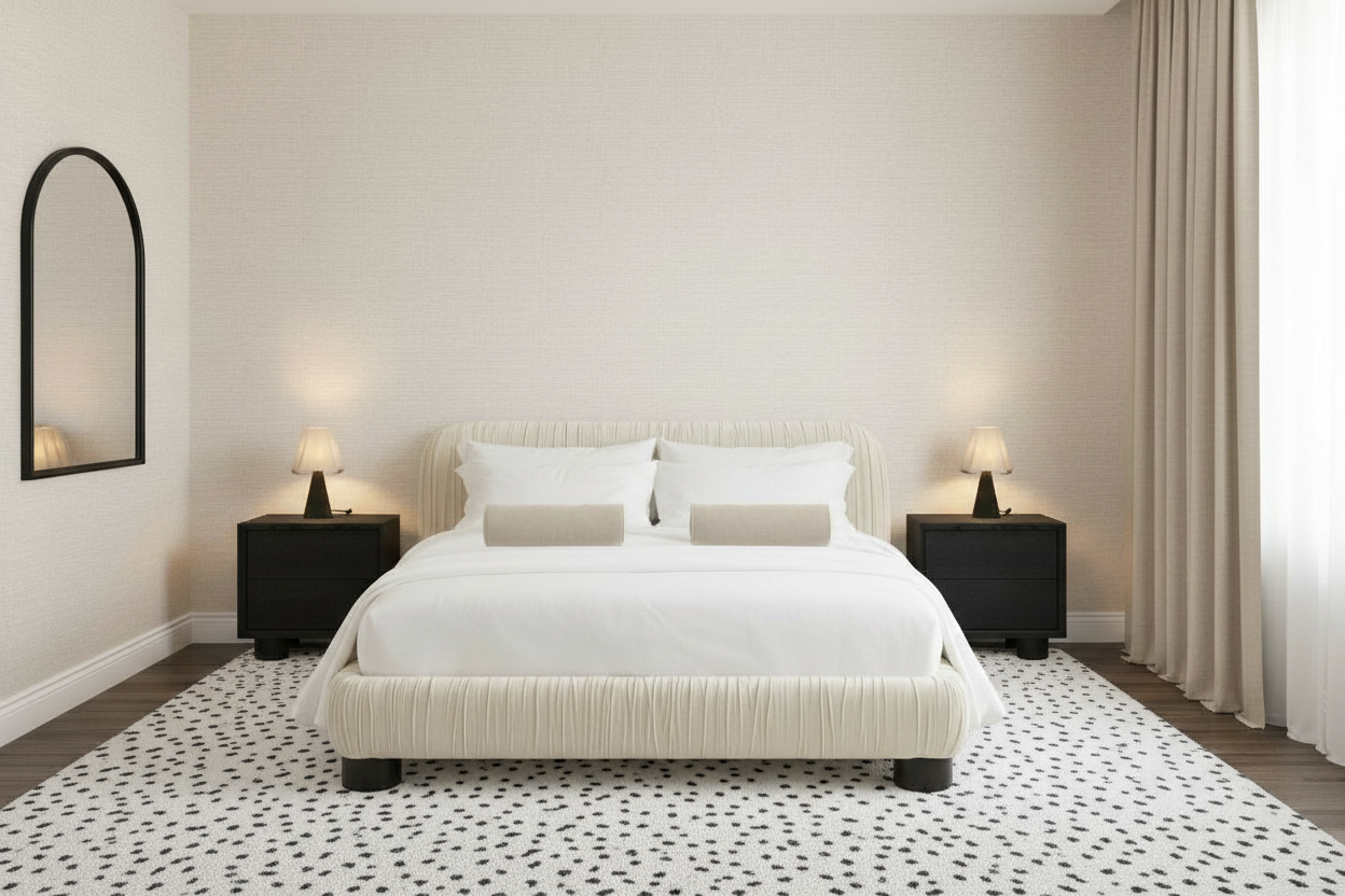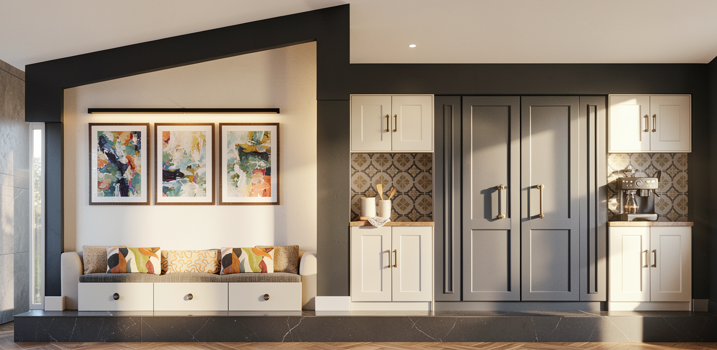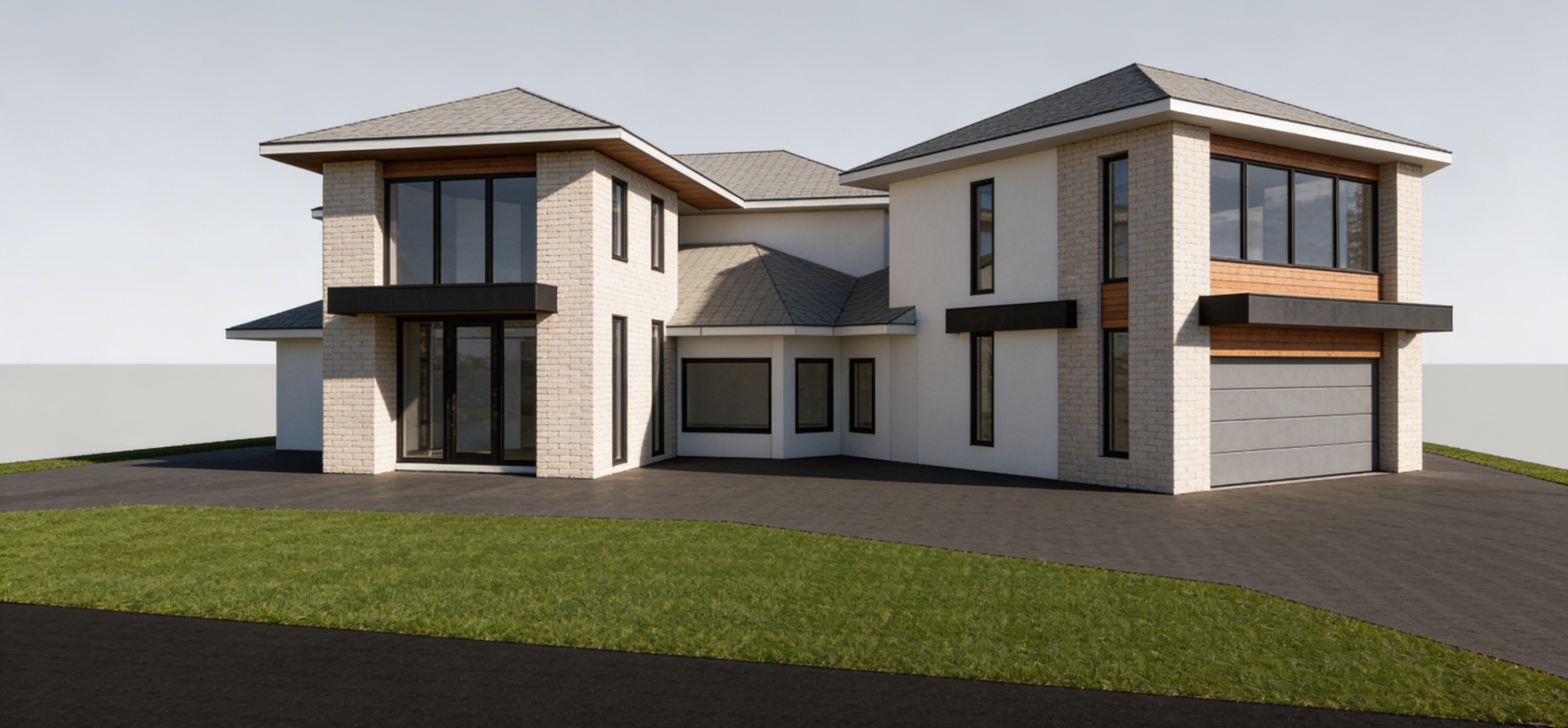 use walnut floors and white oak cabinetry to make 3d kitchen in a muted modern style with traditional molding and cabinetry architecture