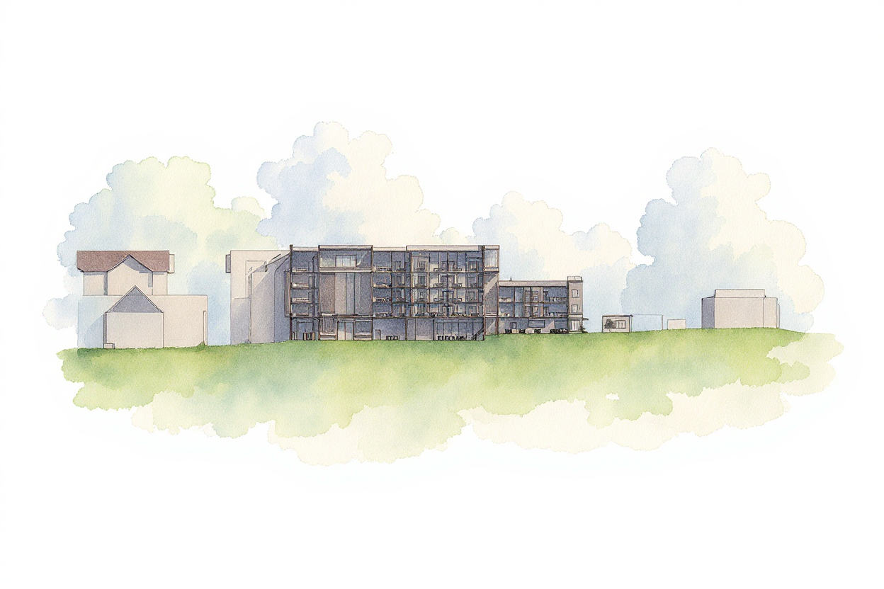 render this section drawing in a soft architectural watercolor style while strictly preserving all geometry and interior layouts exactly as shown do not modify the location or proportions of rooms windows doors stairs corridors furniture or structural elements maintain exact level alignment and section cut thickness add soft architectural shadows to give depth keep shadows subtle consistent with a daylight source coming from the upper left apply shadows only to masses recesses balconies overhangs interior walls behind the cut plane and site elements do not distort geometry to create shadows use gentle watercolor washes on walls and floors keeping the linework crisp at the cut plane match the style and color palette of the previous elevations muted grays soft render this section using the exact same soft watercolor style as the reference image do not modify geometry levels rooms windows doors or layout keep the section cut crisp and dark with light watercolor washes on walls and floors apply soft shadows and a subtle ground texture use the same muted palette warm beige light gray and pale green background tones