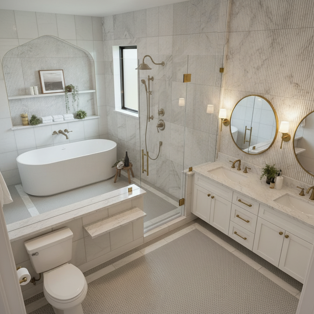 modernize this bathroom make it light organic modern minimal take the person out of the reflection in the mirror change the light fixture and faucet make the cabinet door style more modern