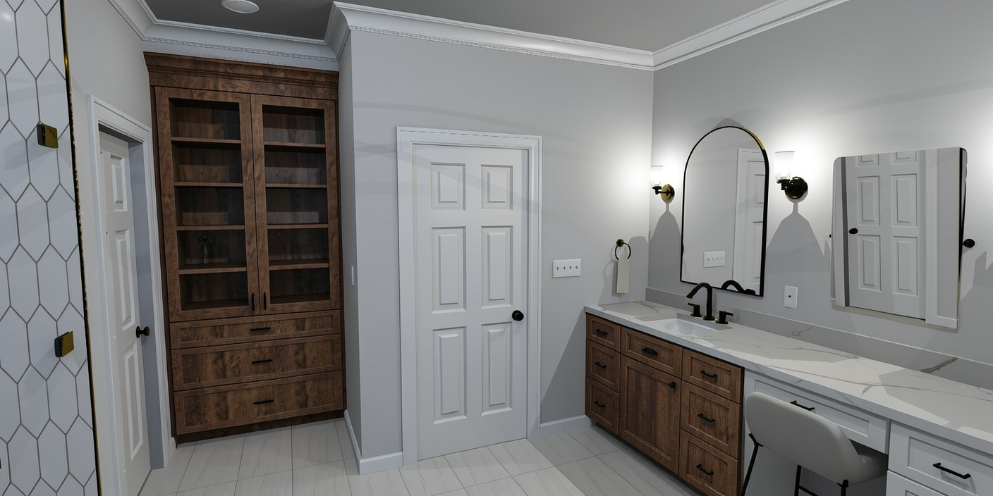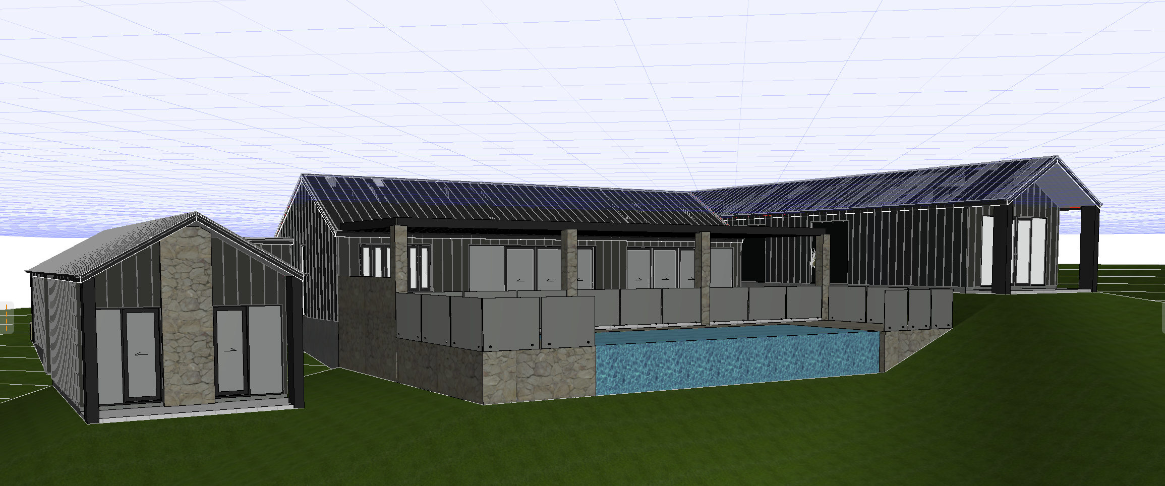 transform this screenshot from archicad into a high resolution render of a house the image shows a back entertaining area with a waterfall edge pool include lots of landscaping the house has a mix of dark vertical cladding and feature stone