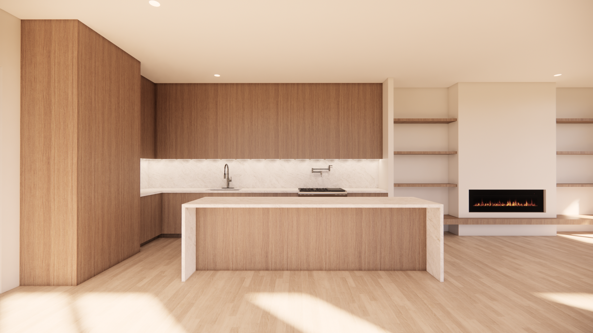 ultra photorealistic cinematic rendering of a kitchen inside a luxury transitional home natural midday sunlight with soft shadows and bright ambient lighting realistic reflections on marble glass and metal surfaces pbr wood grain texture detail with fine anisotropy leica 35mm full frame aesthetic with shallow depth of field editorial color palette warm whites rich walnut wood and soft daylight neutrals balanced highlights natural contrast and soft reflections for a refined architectural digest style composition