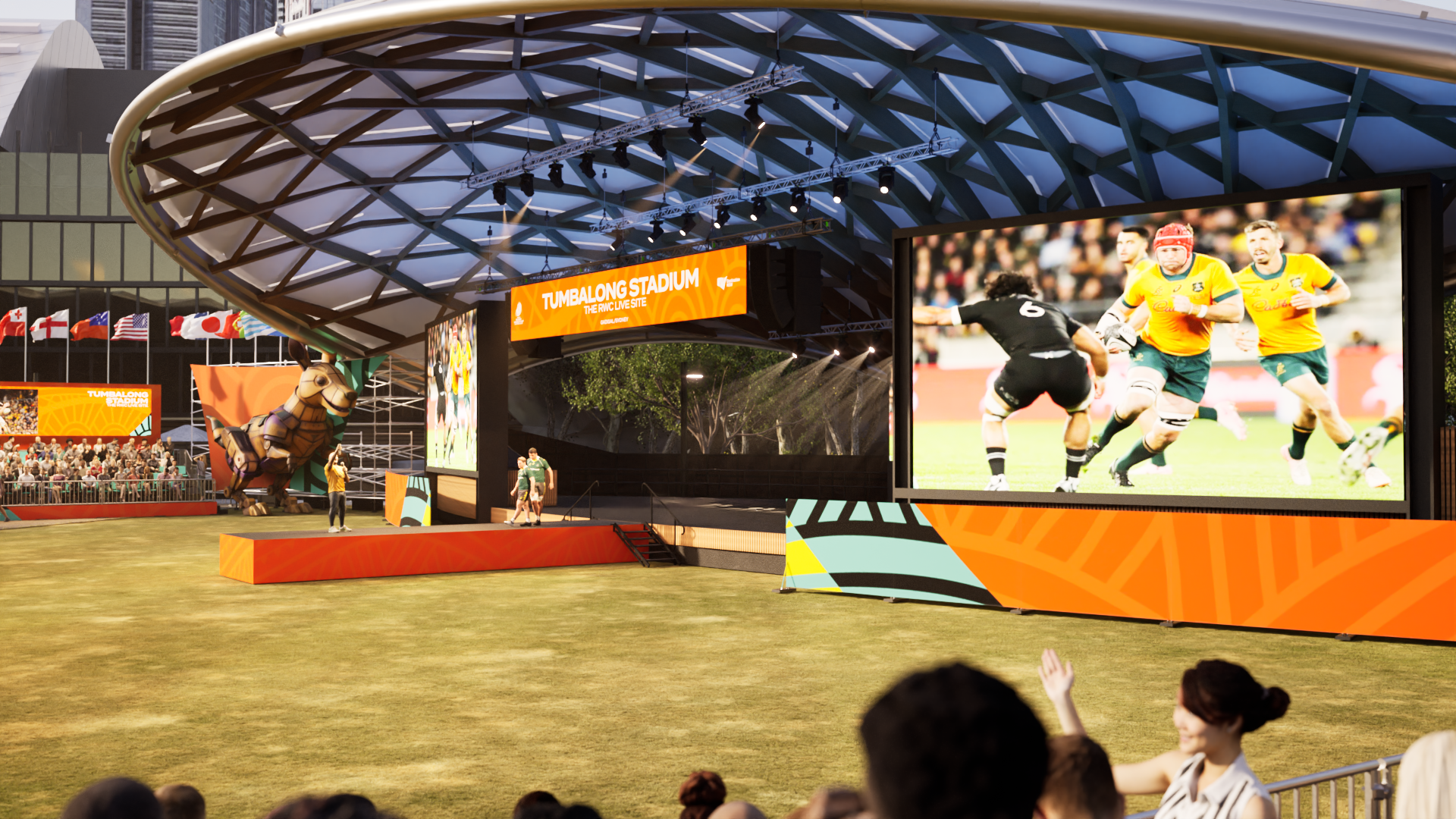 generate a vibrant scene of a modern outdoor stadium with a large open air structure featuring a geometric white and dark blue latticed roof highlight a massive led screen displaying a dynamic sports event in vivid colors with players in bright yellow jerseys against a blurred crowd the atmosphere is lively and energetic with an engaged audience include an ornate kangaroo sculpture on an elevated orange platform use a palette of bright oranges greens and blues with a background of modern city skyscrapers to convey a festive and lively ambiance flags of various countries flutter in the breeze adding an international flair to the scene