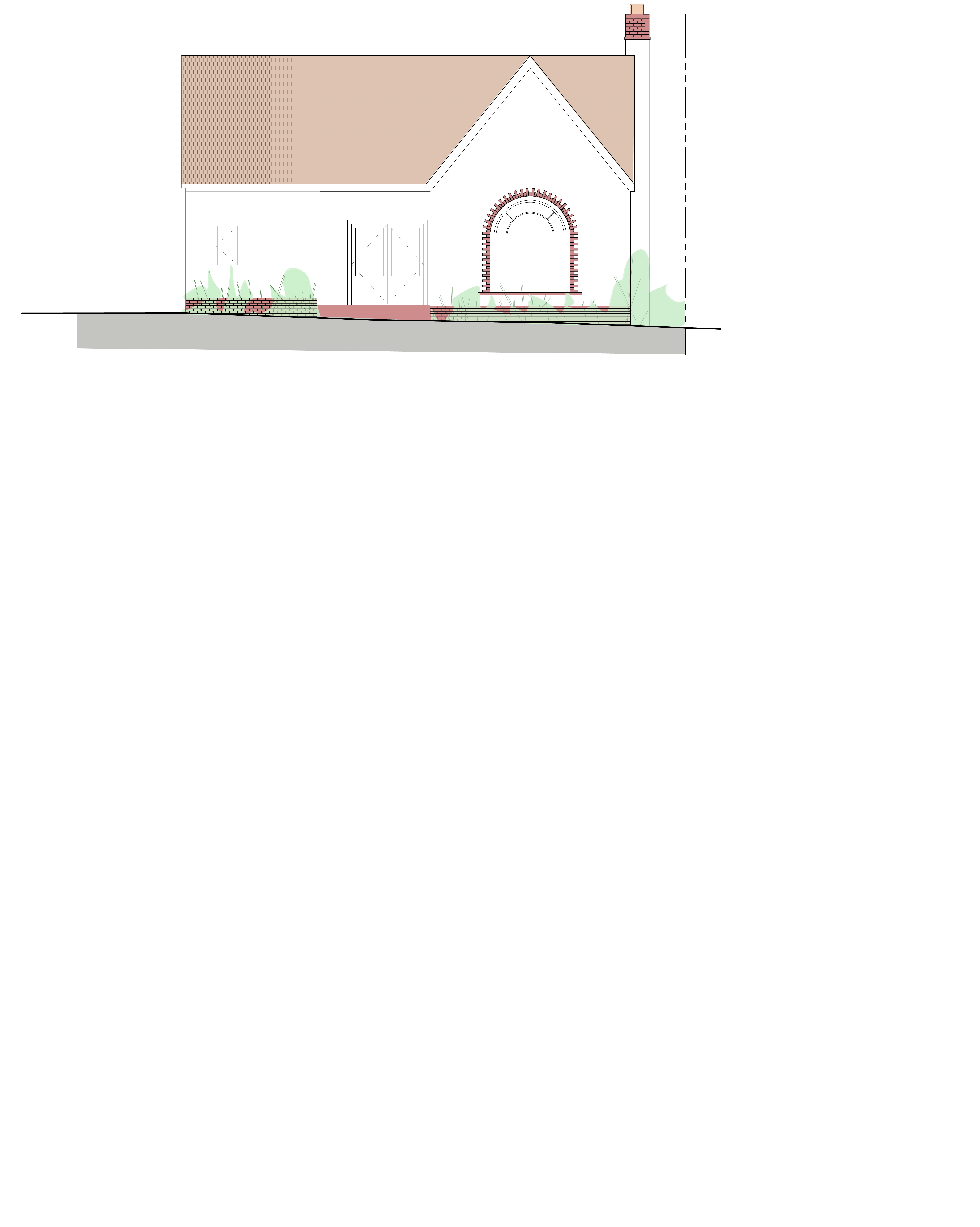 reddish brown asphalt shingle roof light sage green stucco window have thin dark frames and are set in from stucco wall slightly brick porch with 12 inch high brick wall that is 1 step from front yard front yard has a brick walkway california native plants and flowers oak trees citrus trees planted in an organic way