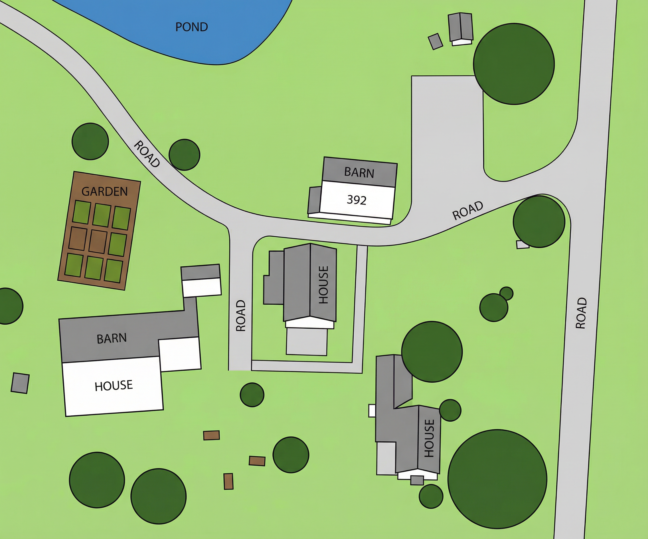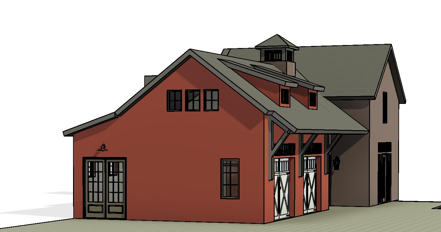 do not change the building shape or details use red vertical wood strip siding for the front half of the building and utilize dark brown vertical wood strip siding for the back half of the building place the building near a tree line in a short grass field that is gently sloping front to back make the lighting a warm late afternoon with the sun location from the top right corner