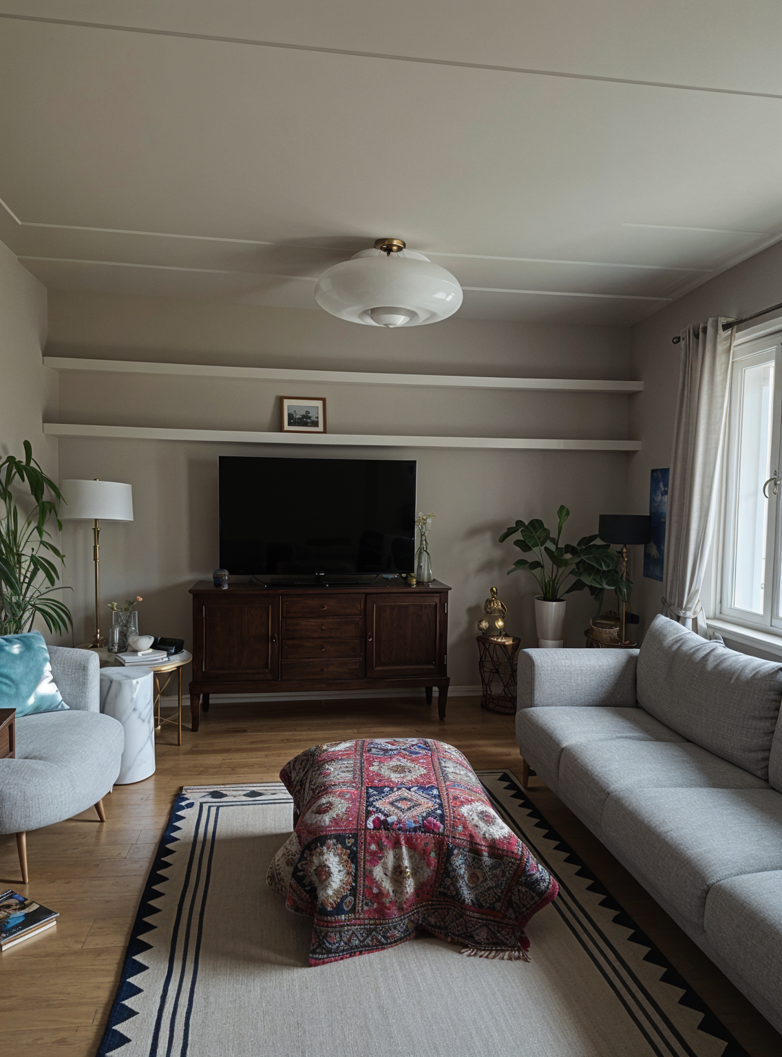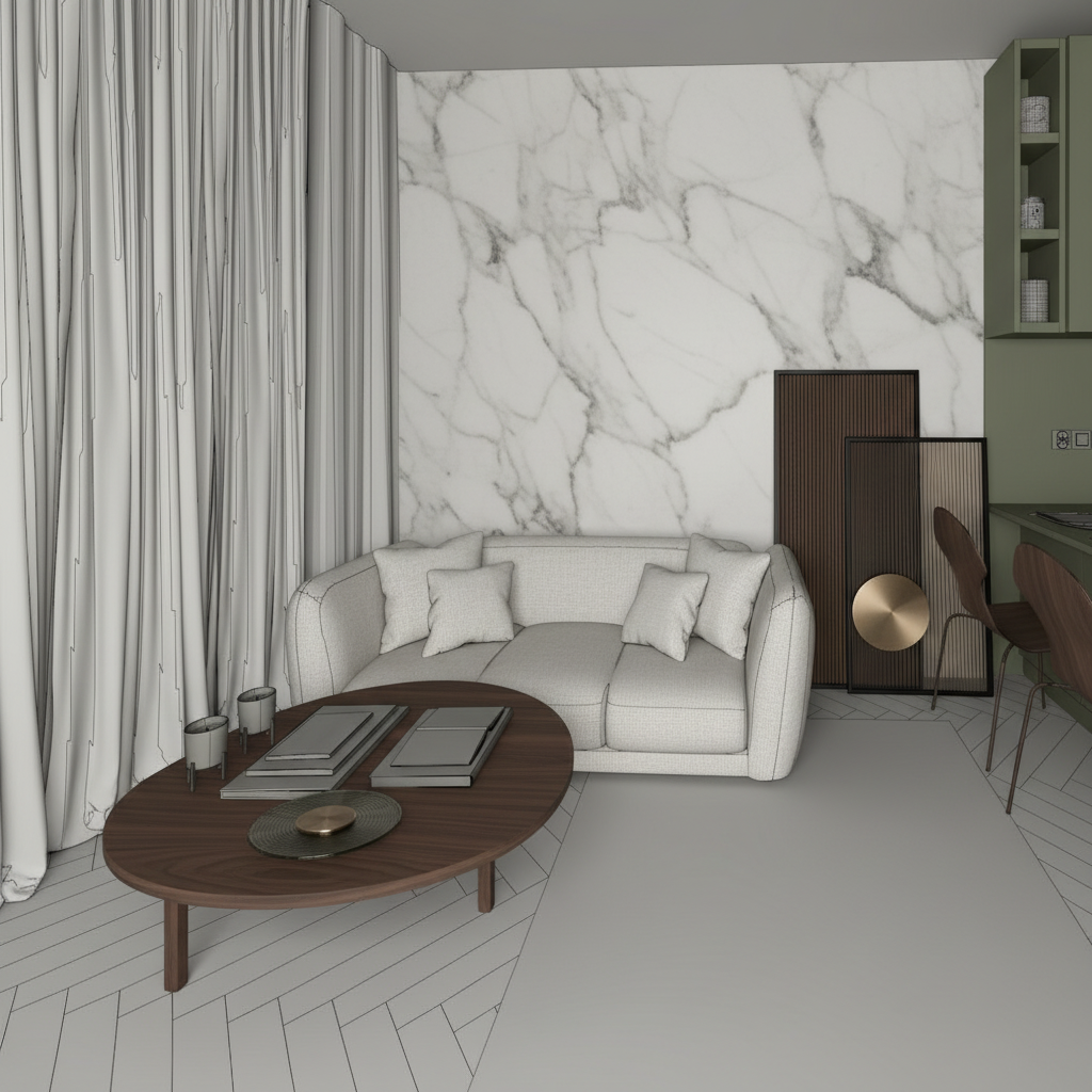 redesign this architecture office interior keep the exact same room layout windows flooring and furniture arrangement placement change only wall finishes textured wallpaper in warm neutrals or subtle patterns one accent wall in soft sage terracotta blush replace furniture pieces with modern elegant designs in same positions curved sofas sculptural chairs refined desk in neutral tones with subtle color accents update lighting fixtures to contemporary statement pieces add brass gold accents curated art plants sophisticated with subtle playful touches same spatial organization new aesthetic architectural photography style photorealistic