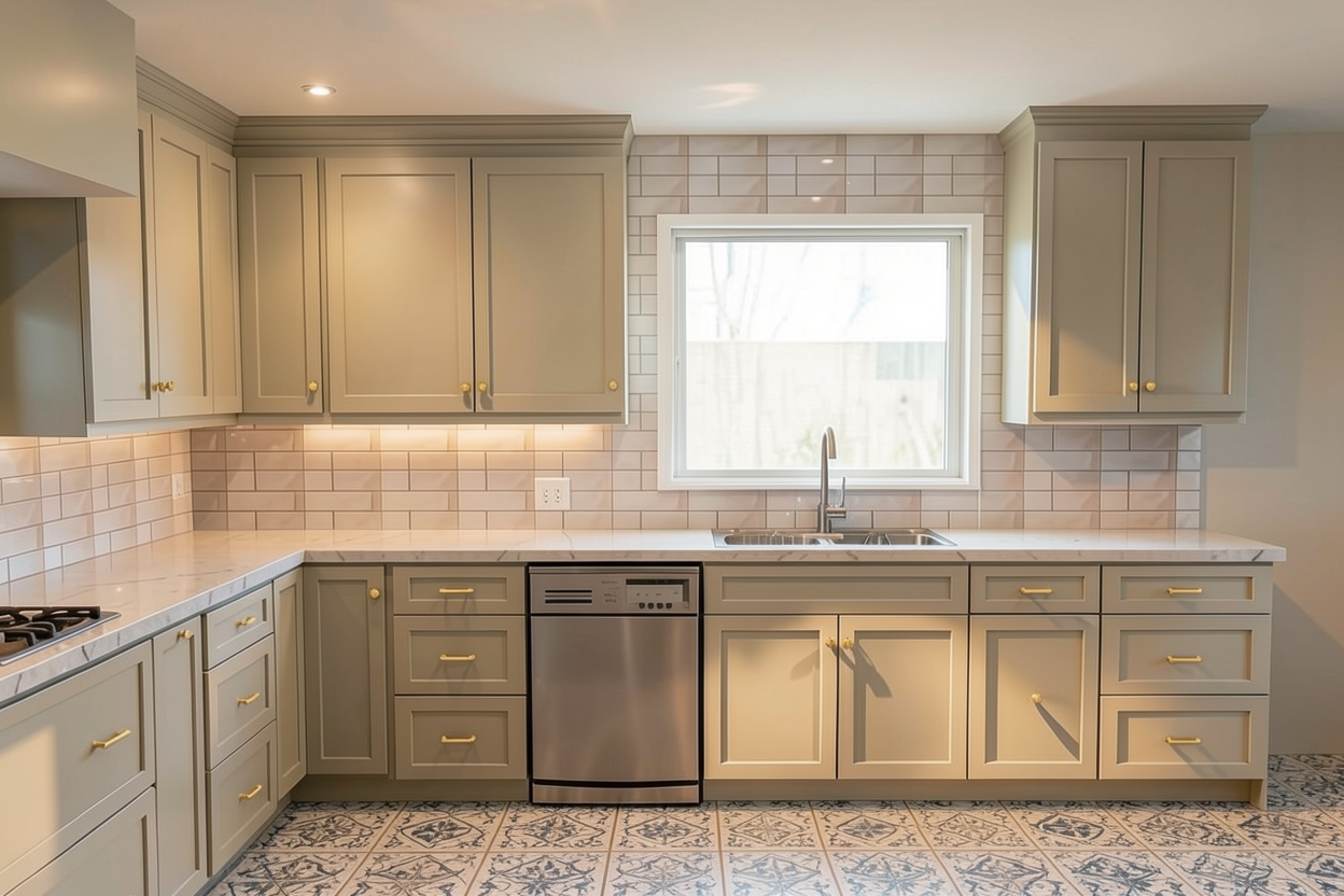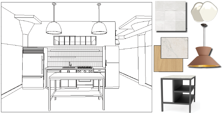modern warm residential loft kitchen polished concrete floors white walls and white concrete ceilings are painted smooth creamy white like the paint chip in the photo 5x5 glossy off white tile backsplash vertically stacked floating shelves on backsplash wall are light oak kitchen cabinets are a light sesame elm wood like the sample in the photo white marble countertops on back kitchen counter like the sample in the photo base of island counter in foreground painted dark graphite gray white marble countertop on island mauve colored metal pendants like the light fixture in the photo use a combination of soft interior lighting and exterior golden hour daylight do not change any building geometry do not change or add any architectural elements do not change windows or doors keep camera view and angle the same do not add any decor not shown in reference image window above tiled wall has painted white metal frame and mullions