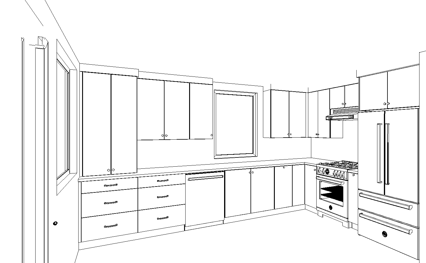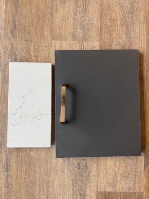 exterior shot cabinets to be slab charcoal with champagne bronze hardware countertops should be arenite cream and the backsplash should be classic white subway tile cabinets should go to the ceiling