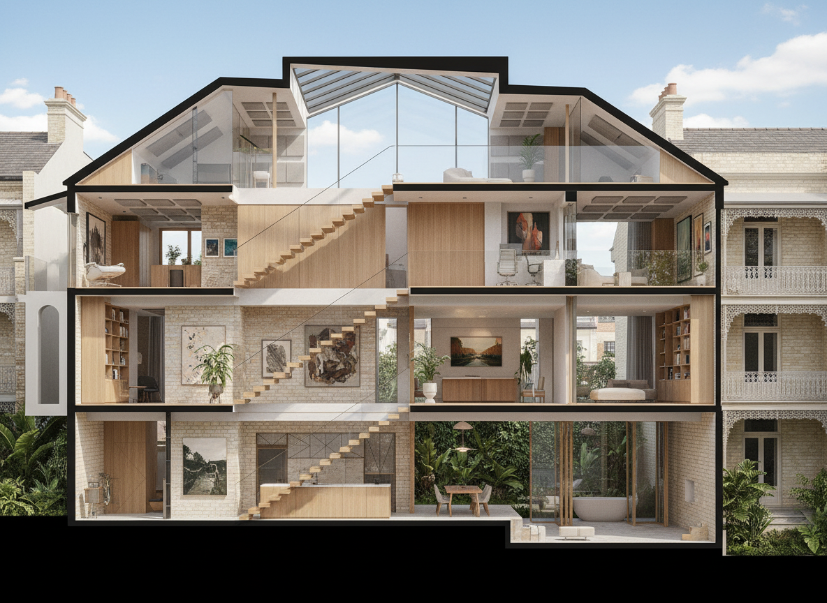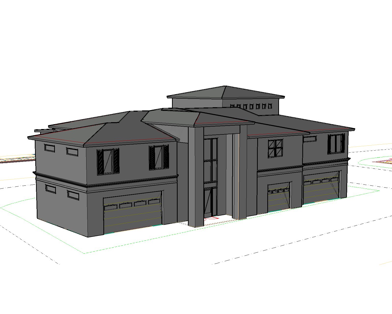 contemporary exterior shot a modern farmhouse white walls and with metal dark gray roofing and a 3 car garage on the left white hardi plank horizontal exterior walls surrounded by lush greenery in florida setting plain concrete porte cochere surround it with palm trees and a dawn setup with lights lit up architecture