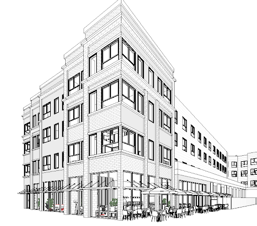render this image with black brick and metal brown window framing show lights coming form some windows and a lively restaurant ambiance on the first floor with people dining summer daytime view