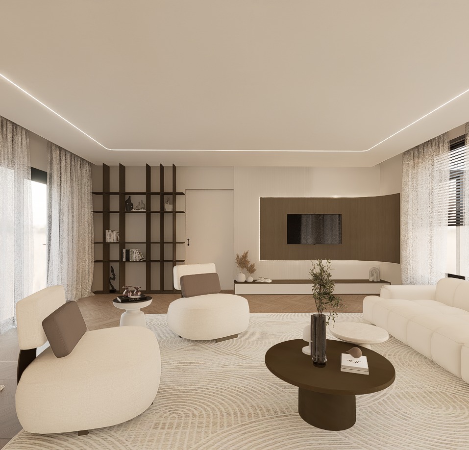ultra realistic interior render of a modern minimalist living room preserve the exact layout proportions furniture design and materials from the original image do not modify architecture or furniture placement enhance realism with physically accurate lighting soft natural daylight coming from the large windows subtle warm indirect led ceiling strip lighting high dynamic range exposure balanced highlights and shadows realistic material definition soft fabric sofas with visible micro texture matte wood finishes warm walnut tone subtle reflections on coffee tables slightly reflective tv panel add depth with global illumination ambient occlusion and soft contact shadows refine details improve curtain fabric realism lightweight sheer natural folds soft translucency add subtle imperfections micro scratches fingerprints slight roughness variation on surfaces enhance rug texture soft fibers depth natural shading glass objects with proper refraction and reflection tv screen with subtle dark reflection not pure black styling minimal premium not cluttered keep existing accessories but refine them to look high end add a few modern decor accents ceramic vases books soft greenery on table maintain clean luxury aesthetic poliform minotti style camera wide angle interior shot 24 28mm eye level perspective slight depth of field for realism render quality ultra photorealistic 4k cinematic lighting soft shadows global illumination ray tracing high detail noise free