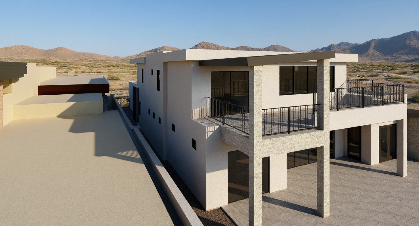 can you take image and make it look more realistic leave all the textures i have on the house the as they are i just want this image to look more realistic can you make the background desert look more native to lake havasu city arizona
