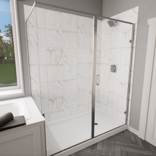 a high end hyper realistic professionally styled real estate photograph of a modern bathroom the scene features strong architectural symmetry and contrast the dominant elements are a large glass panel shower no water spots on the glass