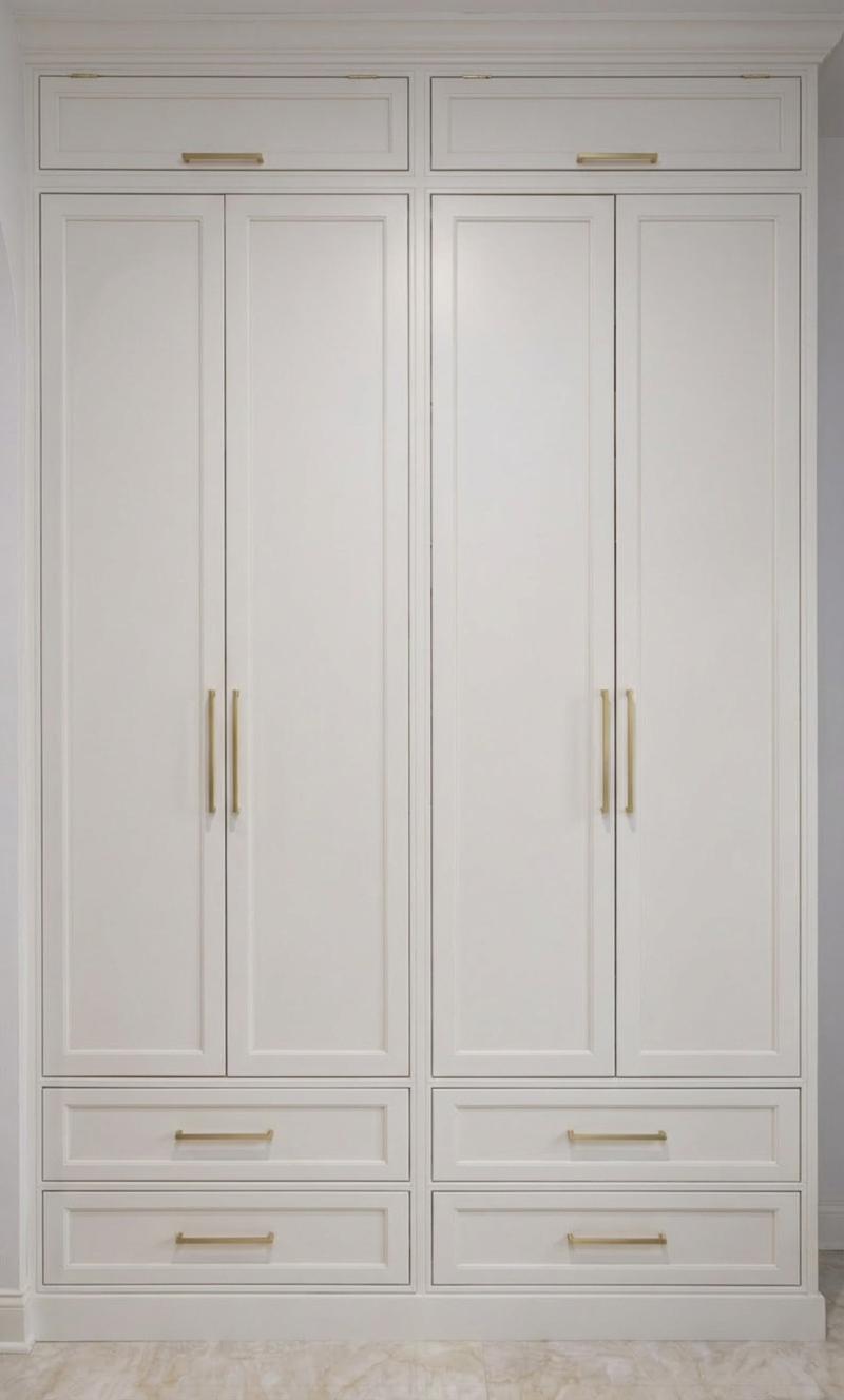 place this cabinetry into a real hallway interior position the built in on the left side of a hallway fully integrated into drywall flush and seamless camera view straight on facing the cabinetry centered so the cabinet reads as the focal point include a front entry door in the background beyond the cabinetry to show depth flooring should match the reference tile soft warm white stone with subtle veining smooth finish cabinetry painted warm white with refined panel detailing aged brass hardware with soft patina lighting soft and natural clean and even style high end residential architectural custom built in millwork quiet luxury no clutter no furniture minimal clean environment