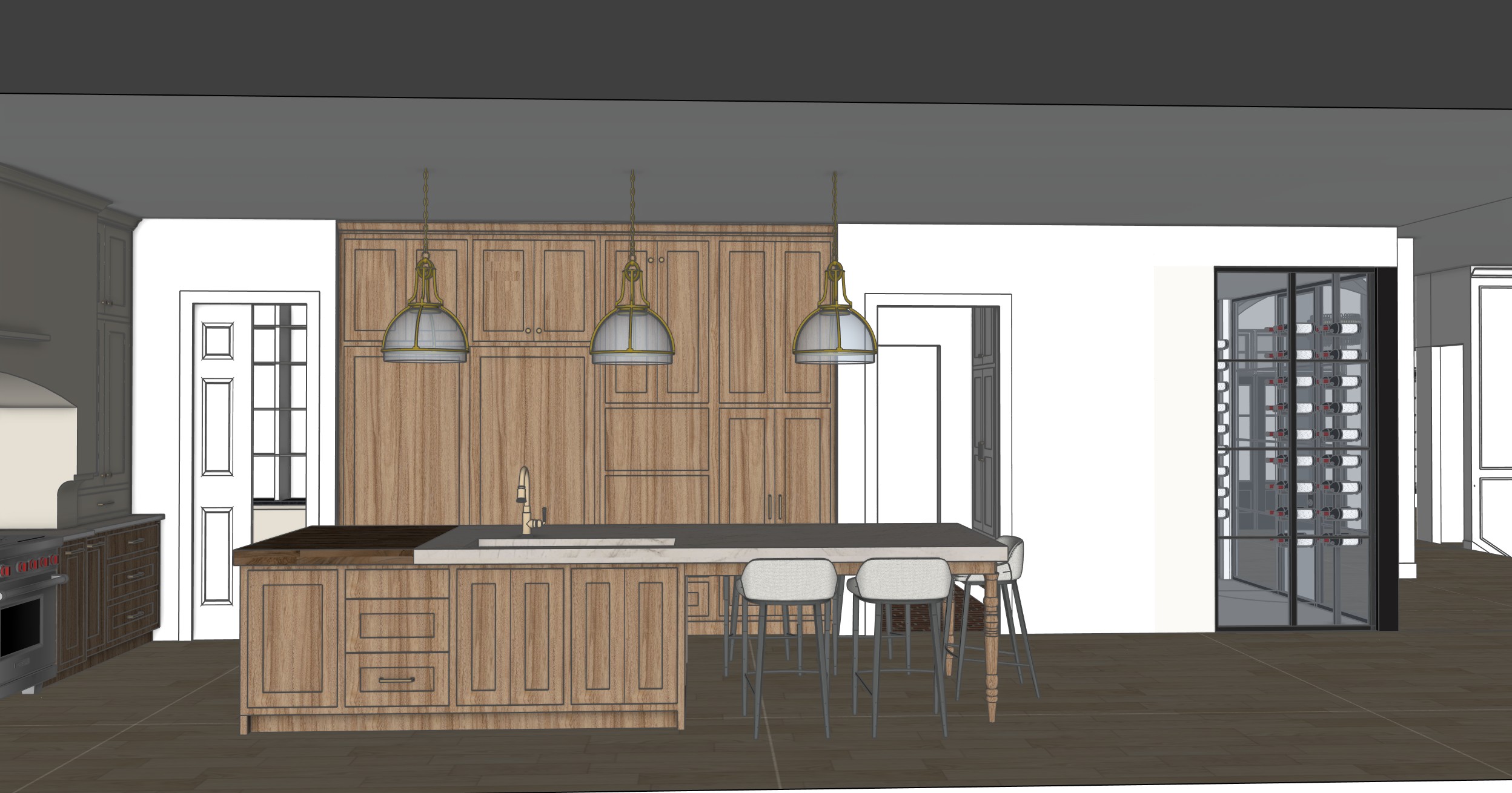 ultra realistic kitchen rendering based on a sketchup model realistic cabinetry materials sw shiitake painted range hood and hutches crystallo quartzite countertops with subtle veining accurate texture scale white oak floors with subtle wear and color variation matte painted walls with slight texture realistic fabric upholstery with visible weave physically accurate reflections and shadows soft indirect light global illumination professional interior photography crisp edges high detail clean modern aesthetic full frame camera 28mm lens