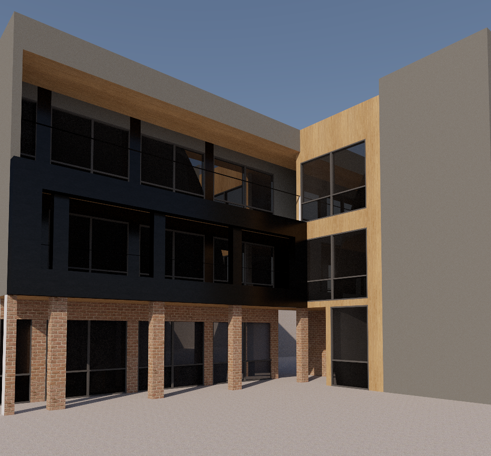 exterior shot modern office building with concrete and brick finishings and black metal accents