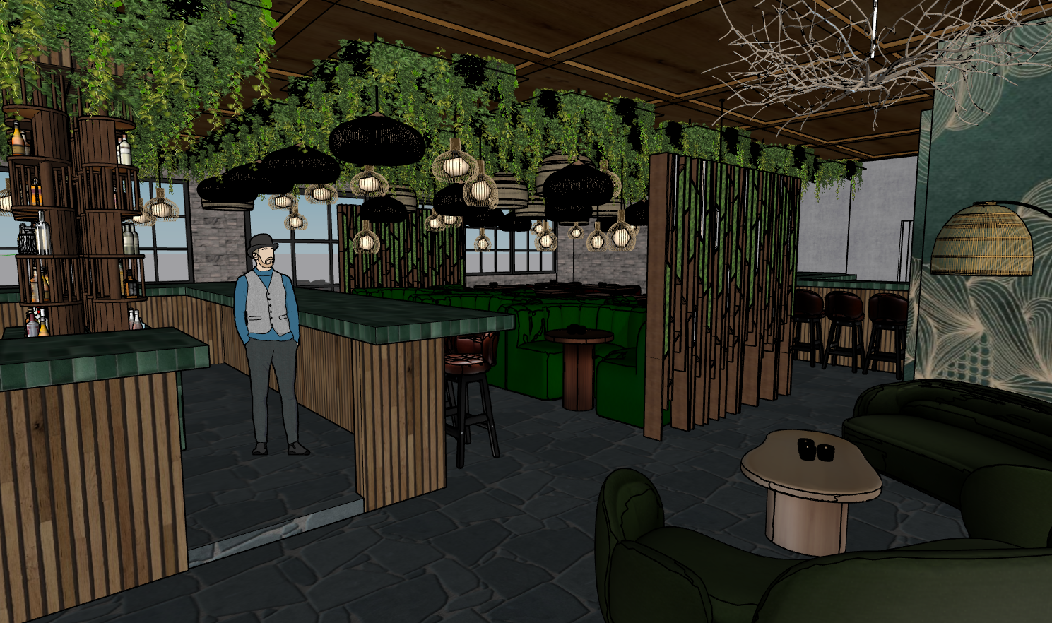 a moody realistic restaurant scene illuminated with dim warm lighting that enhances intimacy while keeping the space comfortably visible gentle highlights