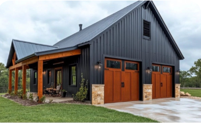 modern exterior shot create a picturesque 80 x 40 modern farmhouse with dark grey steel exterior and dark brown wooden accents the roof is a soft gray metal complementing the elegant style large wooden garage doors with a natural finish add charm surround the house with lush greenery featuring vibrant green grass and tall trees with a mix of green and autumnal orange leaves the atmosphere is serene and inviting bathed in the soft glow of a clear blue sky and warm sunlight capturing a perfect day in the countryside architecture