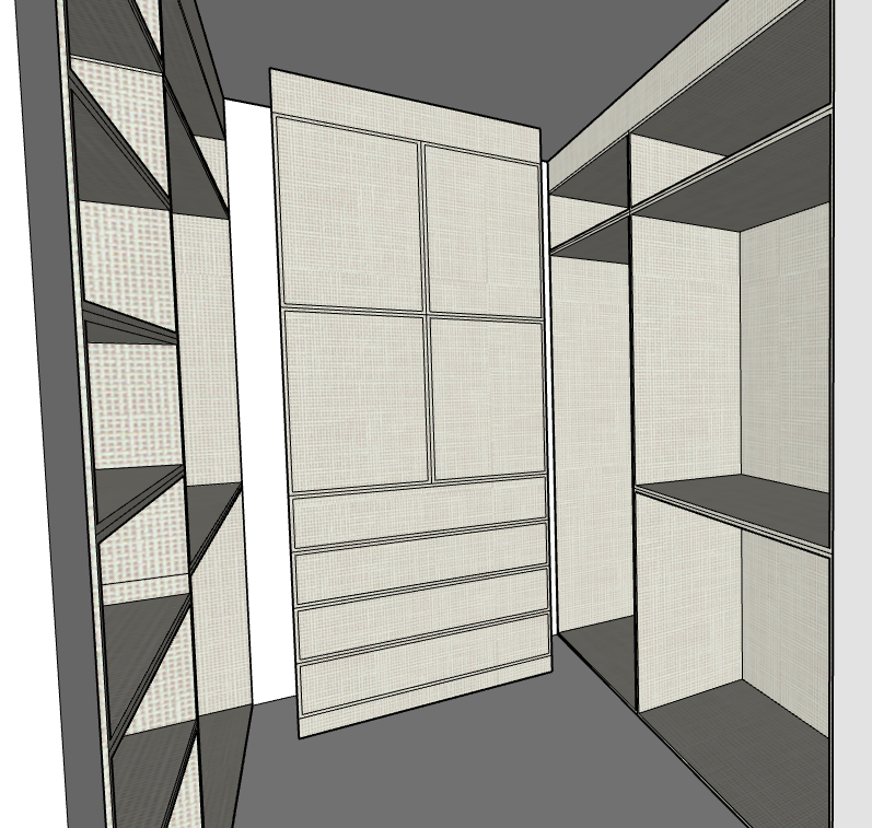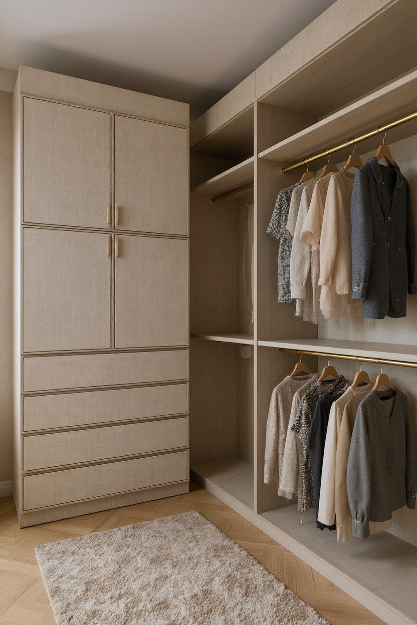 add clothes to the closet hanging rods the material of the built in unit is a light beige linen and gold add handles to the back unit lower the ceiling to the top of the unit