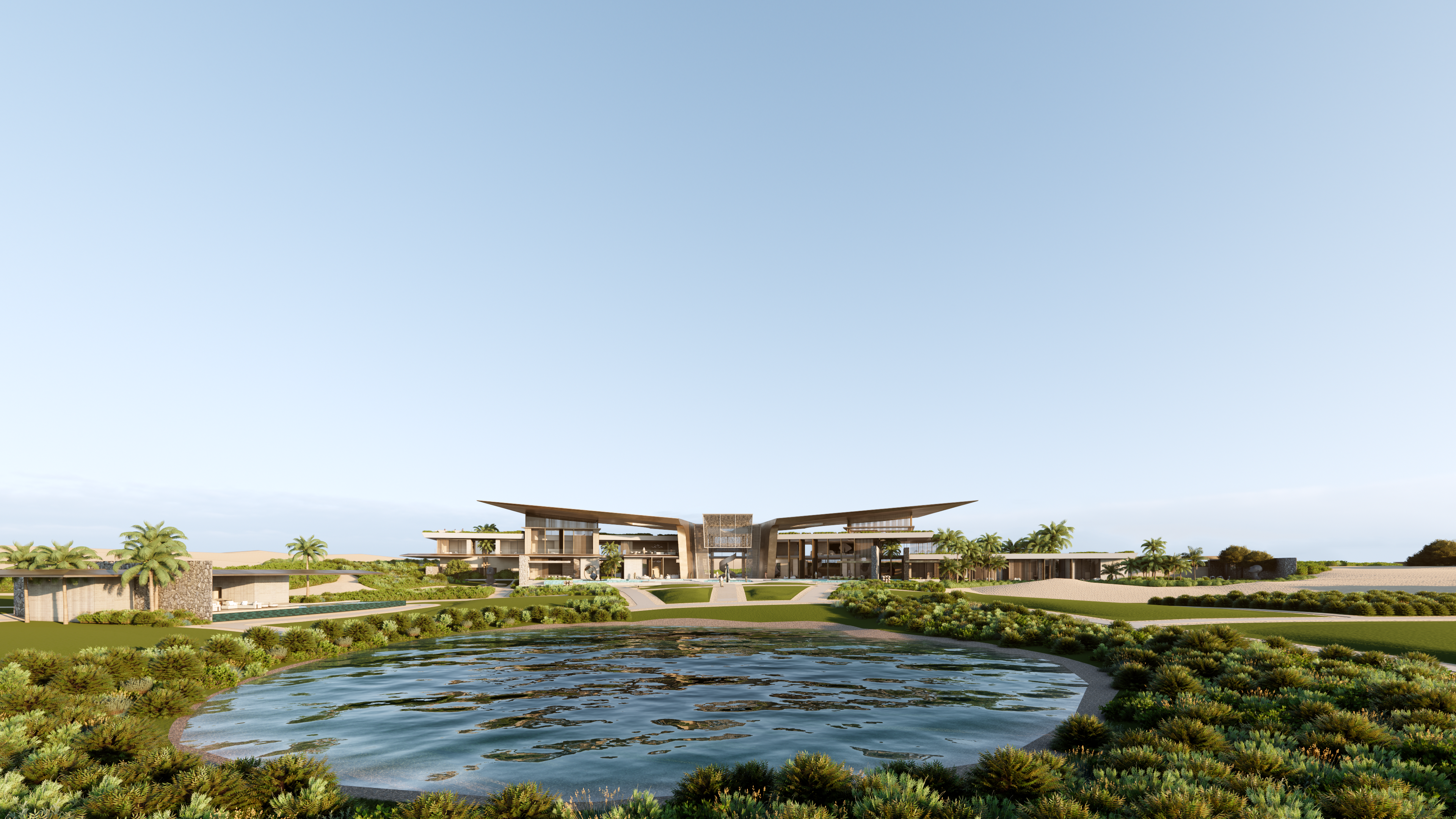 exterior shot create a luxurious modern architectural scene featuring a sleek avant garde building with sharp angular roofs in metallic bronze the structure should feature large open spaces with tall wooden slats and textured gray stone walls place vibrant green palm trees and lush greenery throughout for an organic contrast incorporate a pristine infinity swimming pool with crystal clear blue water reflecting the serene sky add unique geometric sculptures as focal points and scattered contemporary outdoor furniture in soft beige tones set the scene during golden hour allowing for warm sunlight to bathe the environment in a soft inviting atmosphere add two ghazels drinking water from the watering hole in the foreground architecture