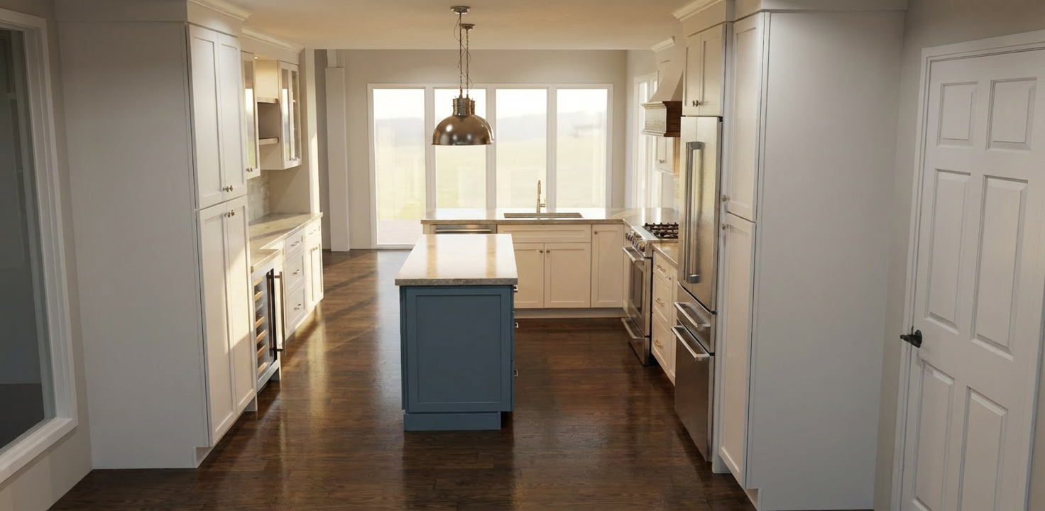 remove the small tables and keep the lights above the island and the island color the blue that i had rendered make the lights above the island the same blue color add cabinetry panels to the fridge and dishwasher like they were shown on the image
