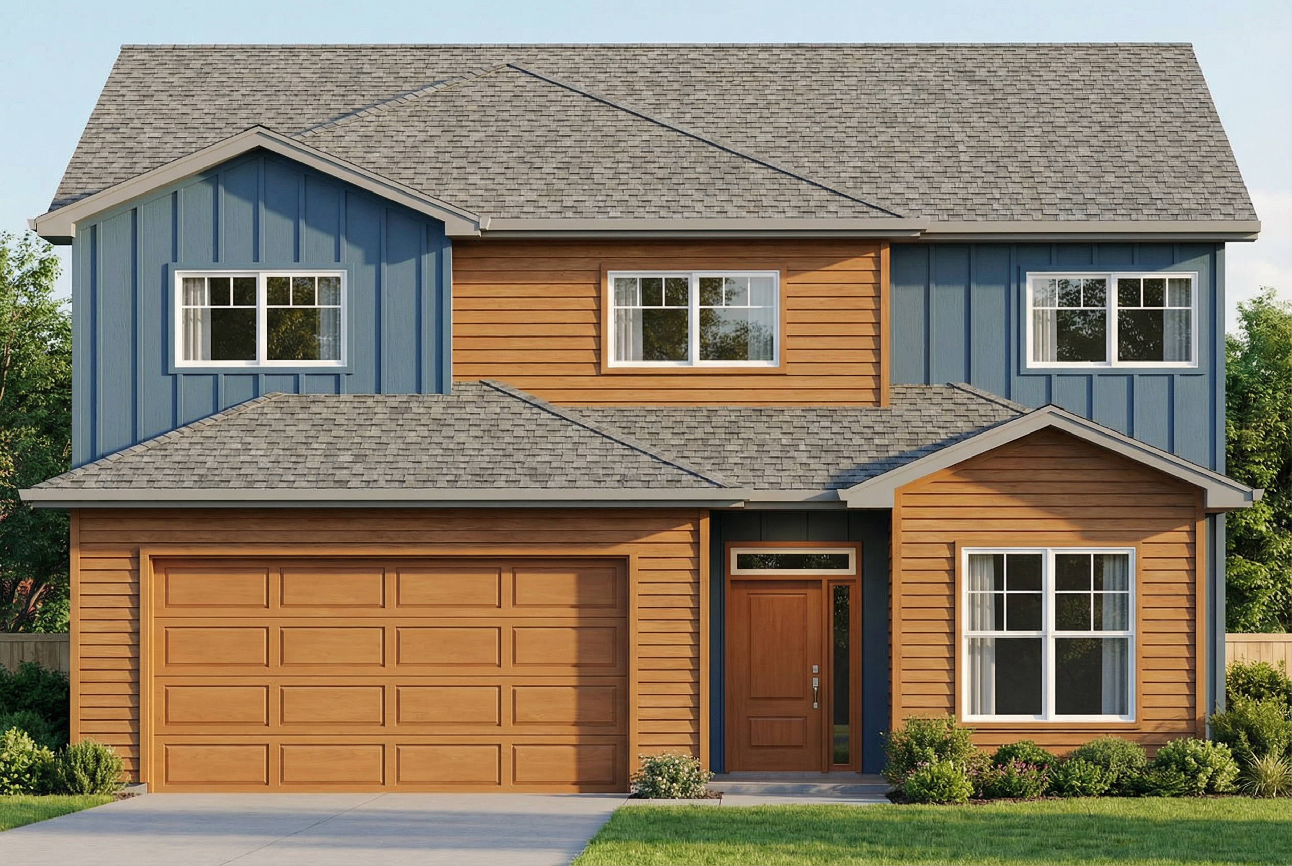 modern timber clad architectural exterior rendered in cinematic golden hour lighting warm low angle sunlight grazing natural wood textures high fidelity photorealistic visualization crisp shadow falloff refined fa ade geometry richly detailed grain patterns soft atmospheric depth subtle lens bloom calm minimal landscaping mountain in the background less trees premium architectural photography mood ultra clean composition and materials