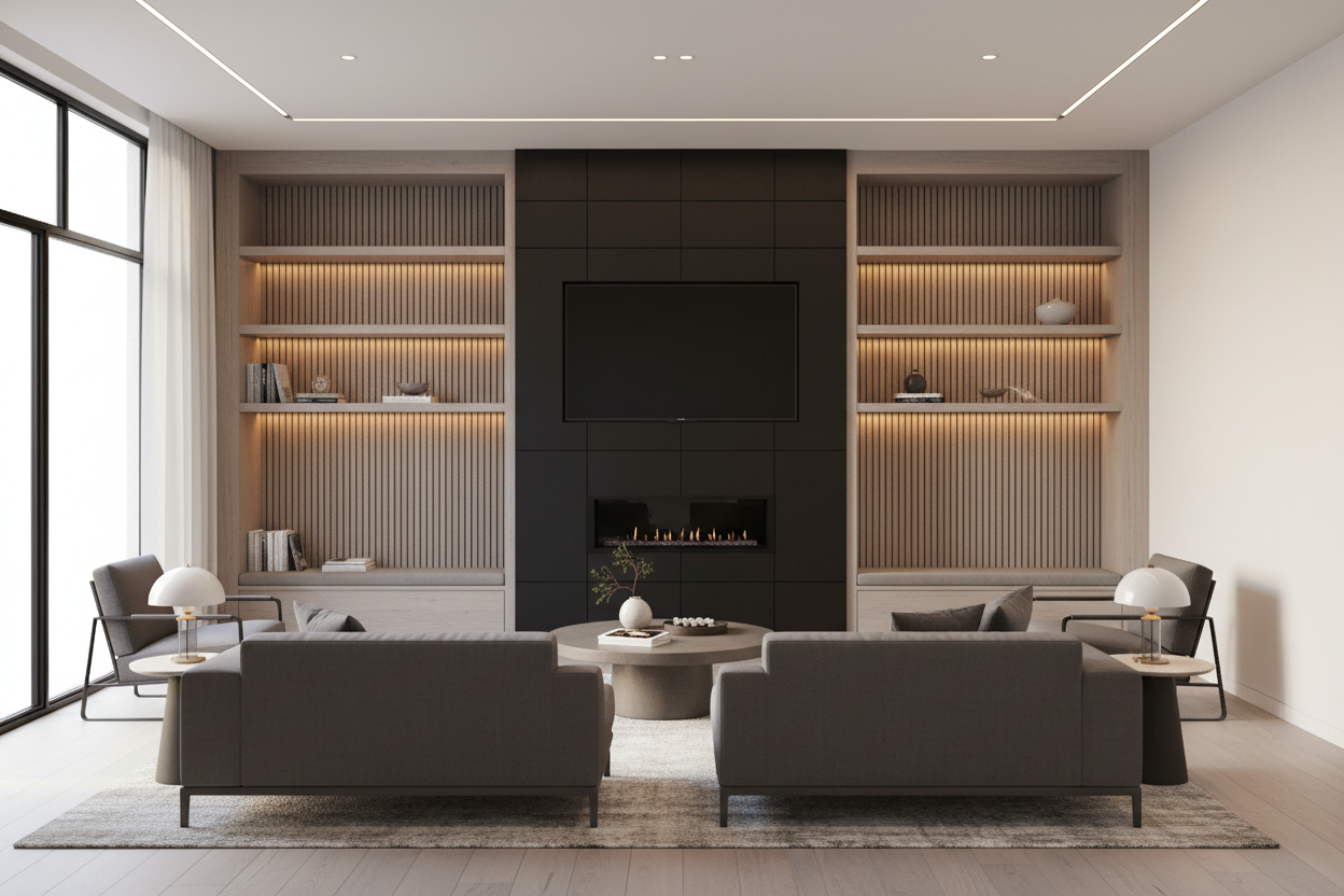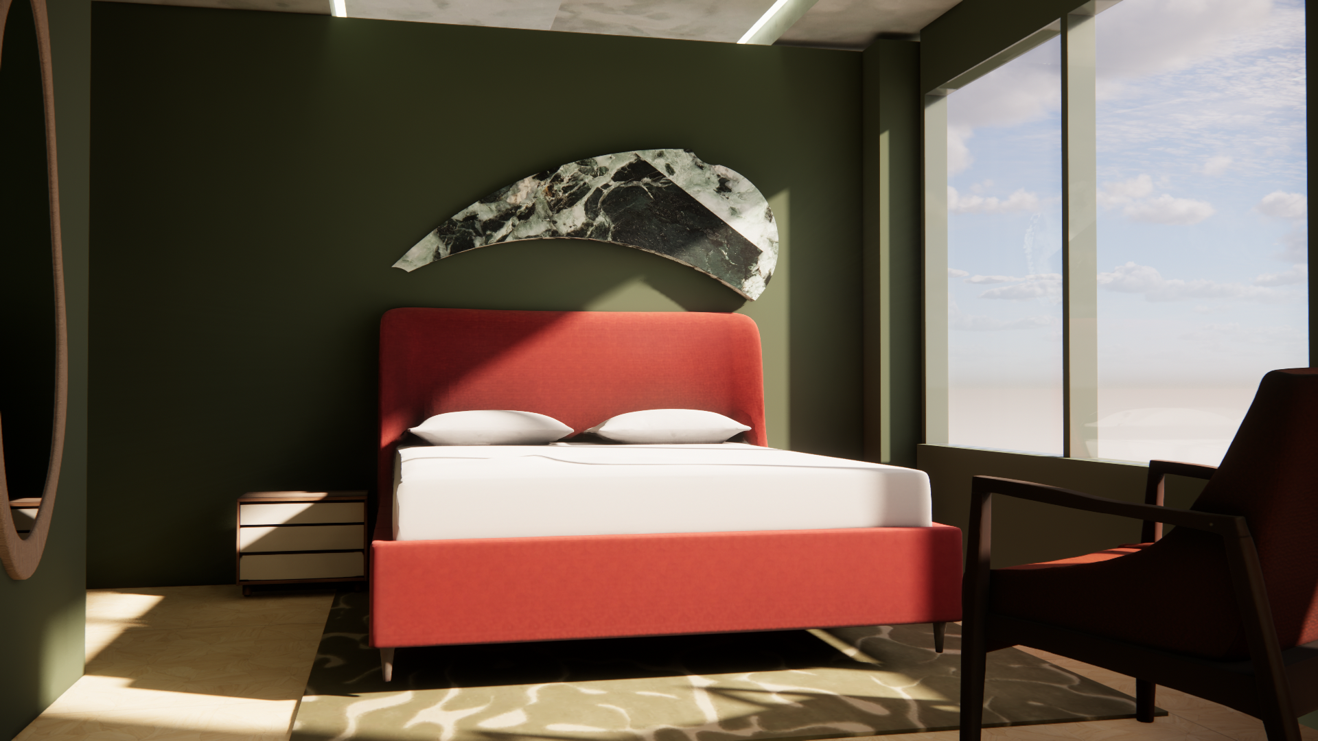 luxury bedroom interior deep green walls terracotta red upholstered platform bed with tall rounded headboard white linen bedding abstract green marble sculptural wall panel above headboard blonde wood floor with subtle floral grain pattern large floor to ceiling windows with new york city skyline view daytime light green marble ceiling with recessed led light cove casting warm ambient glow mid century accent armchair in dark red round wall mirror low three drawer nightstand dappled sunlight across floor and add cool shaped sconces on each side of the bed