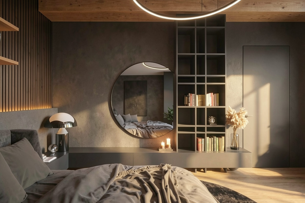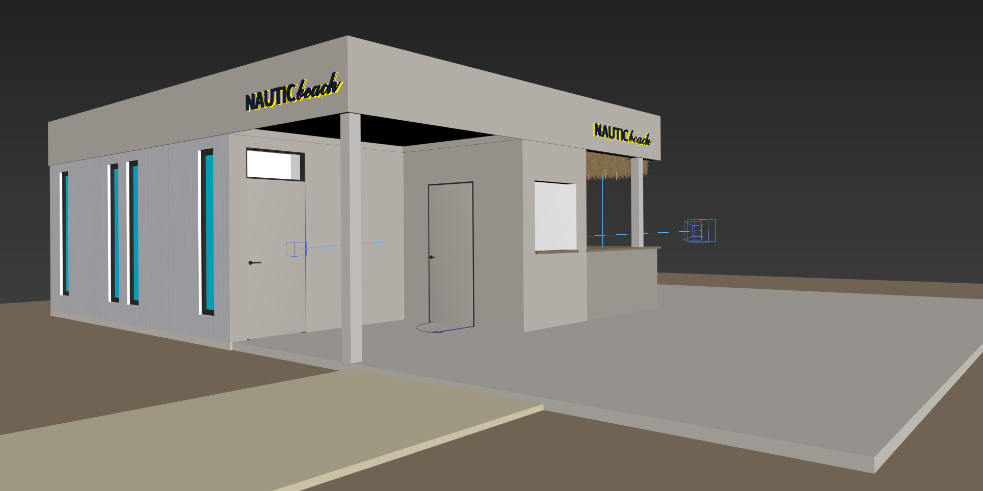 render this beach building which is a beach bar and toilets add sand a beautiful beach with sea in the background add lounge chairs and wooden beach umbrellas in the far background the doors are hidden same colors as the walls add tall palm trees in concrete planters add realism natural sunlight maintain all shapes