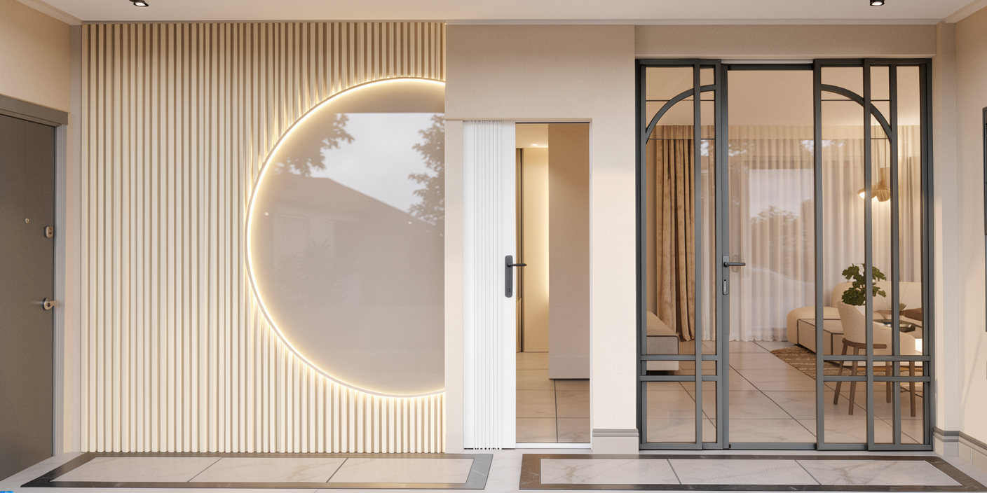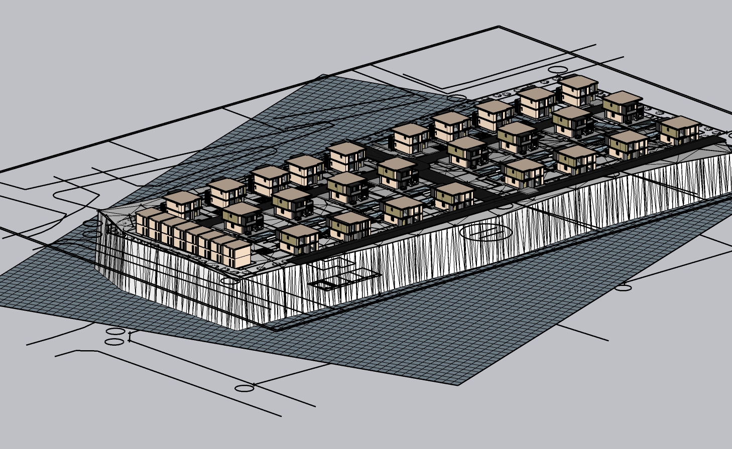 aerial view of a futuristic architectural layout sleek and modern the design consists of small aligned cubical structures on a grid like base render with a metallic silver base the cubical structures in soft beige and light taupe and the connecting lines in deep charcoal the ground beneath is textured with a mesh of steel gray simulating a digital blueprint atmosphere is minimalistic and technical enhanced with subtle shadows and soft diffused lighting