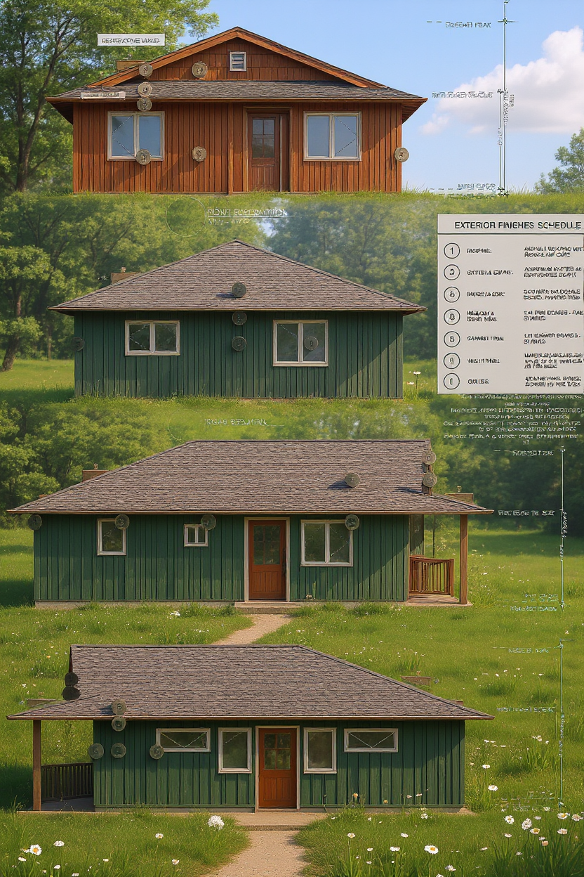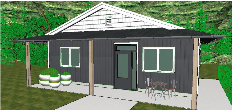 create a serene and inviting architectural rendering of a single story house with a gable roof the roof should have a textured surface with asphalt shingles in a warm gray color the siding of the house is wooden painted in a soft natural beige tone to create a welcoming and earthy appearance windows are framed with white trim for a crisp contrast the front door centrally located is a rich mahogany wood color to emphasize the main entrance add a soft golden sunlight to illuminate the scene casting gentle shadows to highlight the structure s details surround the house with lush green landscaping including small shrubs and a neatly manicured lawn enhancing the tranquil atmosphere the sky is a clear blue with a few fluffy white clouds completing the peaceful setting