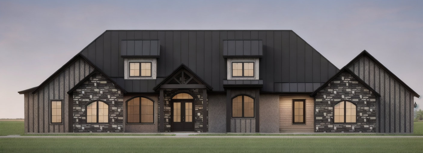 prairie style exterior shot exterior modern farmhouse with black roof black windows black board and batten siding brown wood timbers dark brown horizontal siding white stone white stucco architecture
