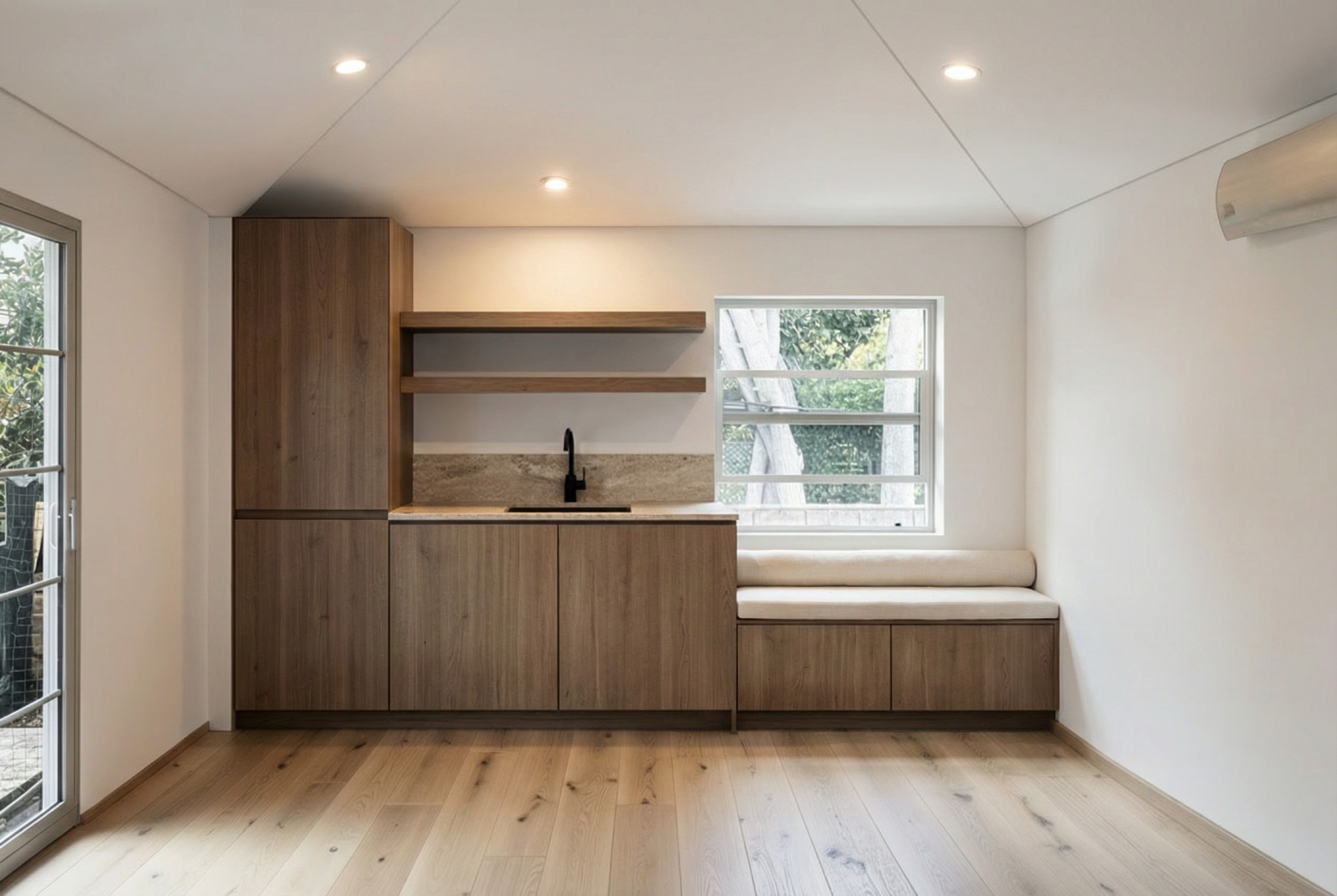 make 2 ceiling recessed lights adjustable bronze thin cylinder spot lights but leave light above sink as a recessed ceiling light and make existing wall ac mini split white