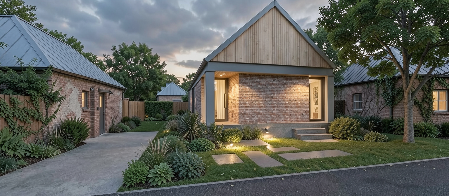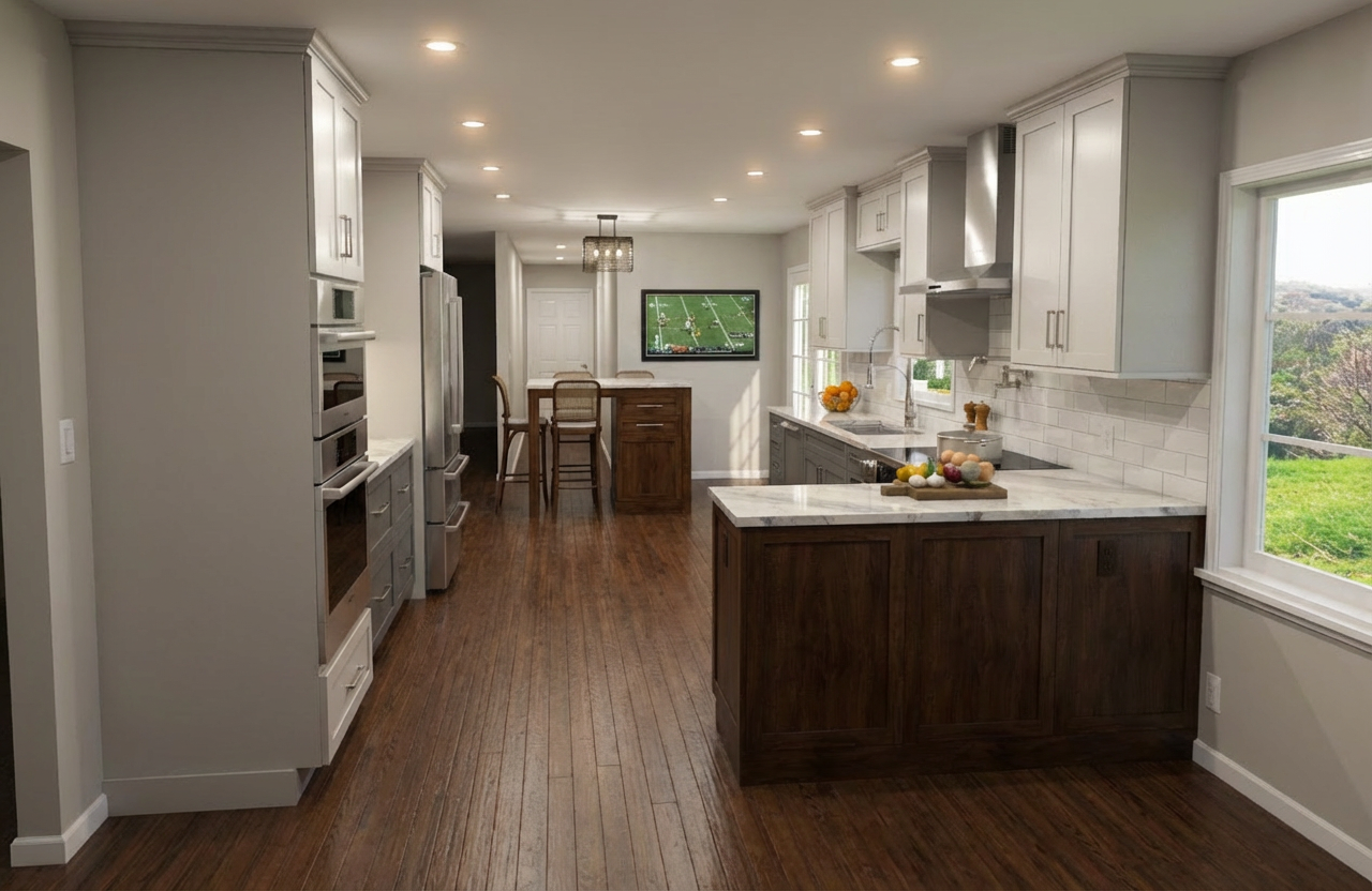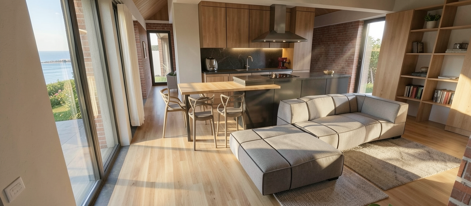 preserve camera composition lighting and all geometry exactly do not change layout proportions materials of existing architecture or light strict object and material edits only wassily chair keep exact geometry replace material with black and white cowhide as in reference short natural fur soft tactile hairy surface clear hair direction visible thickness balanced black white pattern not too fragmented slightly more refined and subtle than rough cowhide armrest straps in smooth black leather frame in highly polished chrome with sharp reflections wood elements doors window frames adjust wood tone to a warm natural medium brown slightly desaturated elegant and soft visible fine grain matte to satin finish not glossy inspired by contemporary timber facade clean calm architectural not orange not yellow coffee table add a round metal side table in front of the sofa positioned close to the front edge of the sofa slightly offset not centered low height minimal cylindrical base with round top brushed stainless steel aluminium finish soft reflections not mirror like no objects on the table important do not add or duplicate any other furniture do not change dining set or kitchen lighting keep original lighting exactly no relighting no color shift no mood change keep everything minimal realistic and architectural