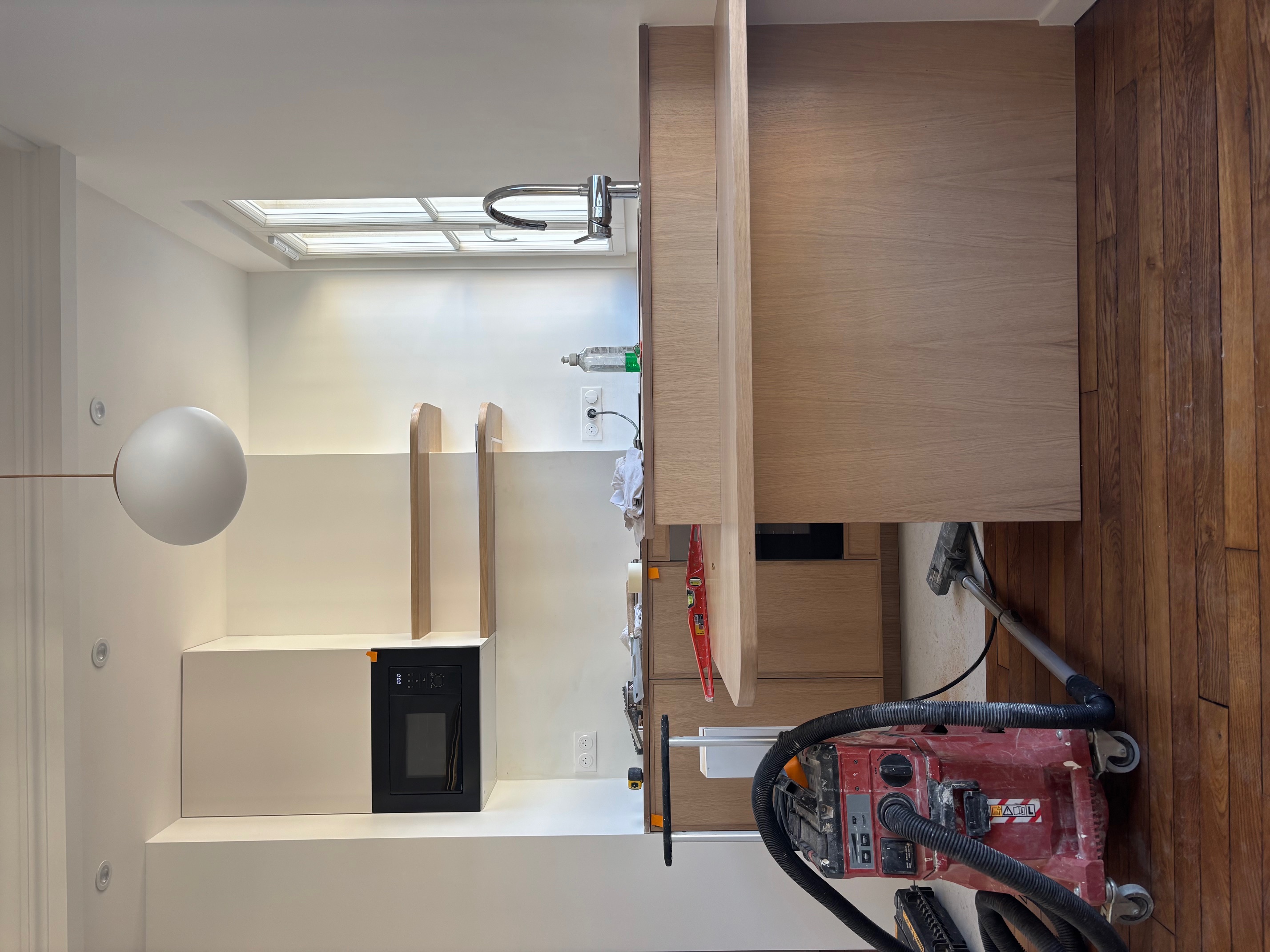 enl ve la spirateur mets une cr dence zellige blanc et un blanc de travail en marbre blanc