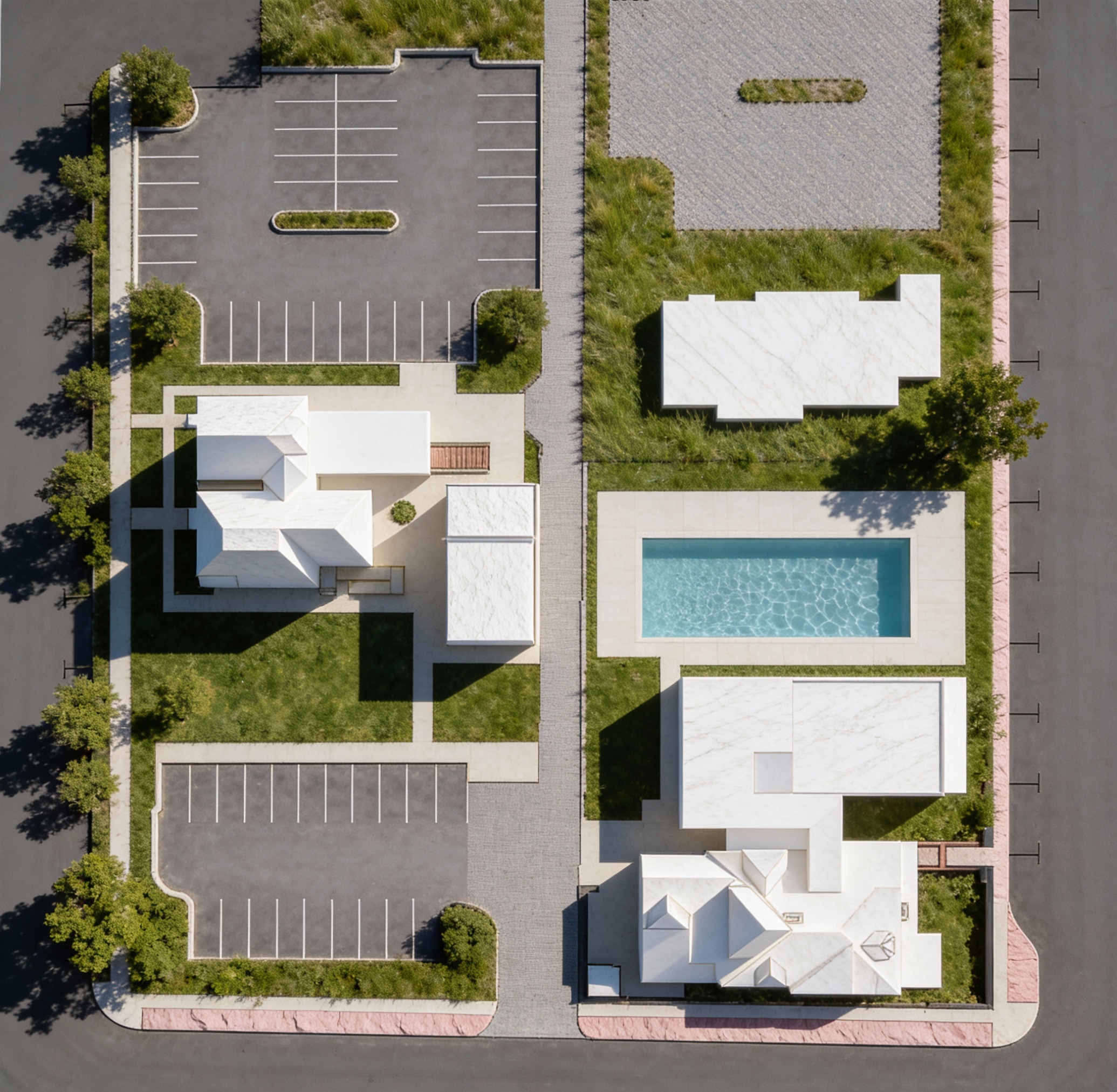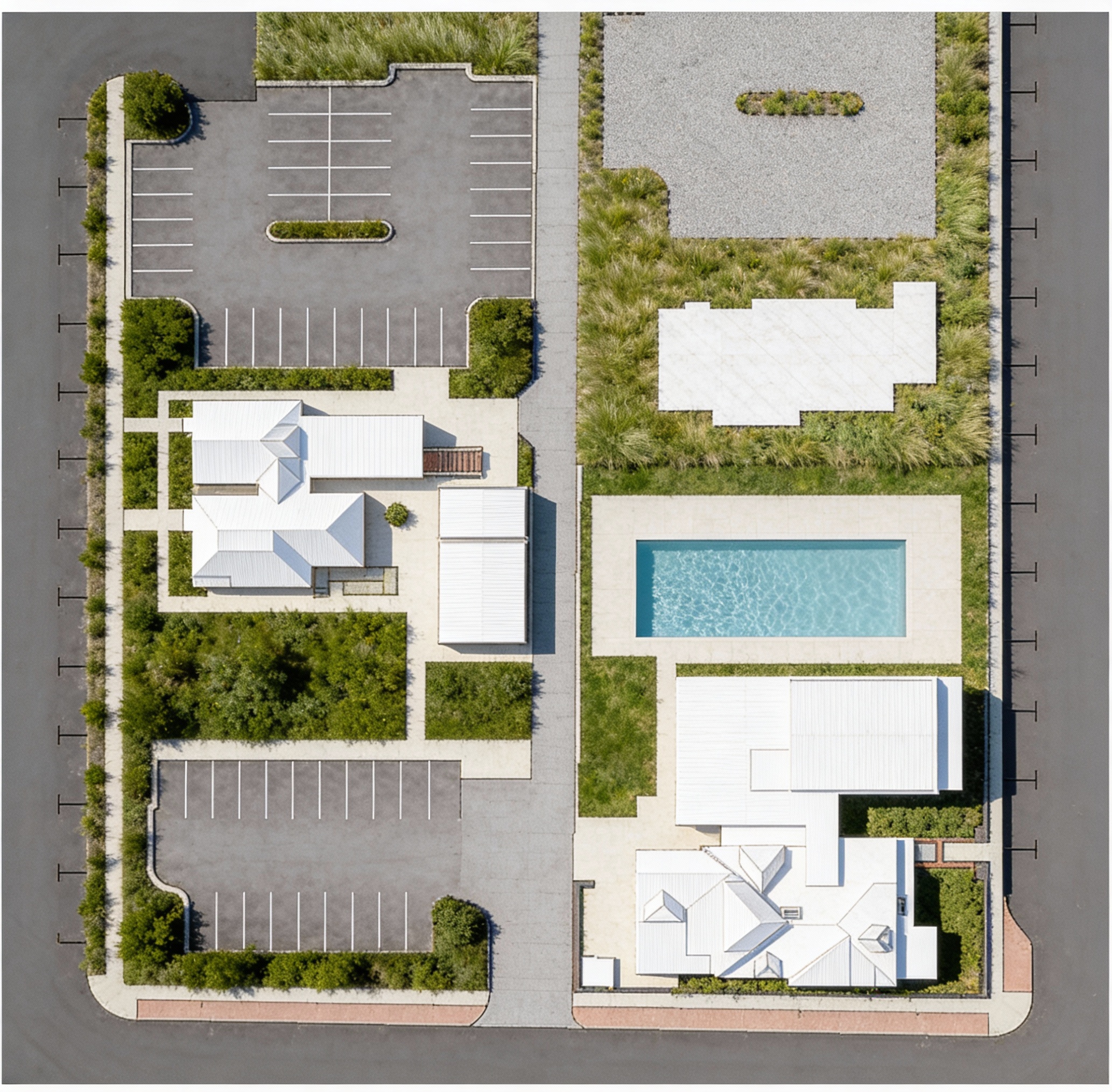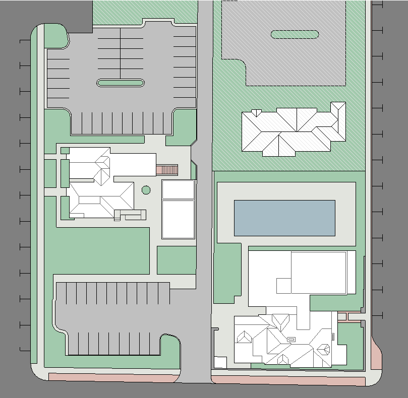 architectural site plan illustration in plan view clean minimal and diagrammatic with soft hand drawn line quality subtle sketch texture calm green oriented color palette simplified landscape elements trees and restrained contrast professional quiet competition ready graphic make the roofs dark put cars in some parking spots