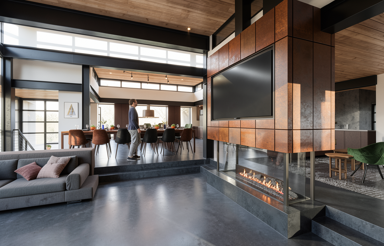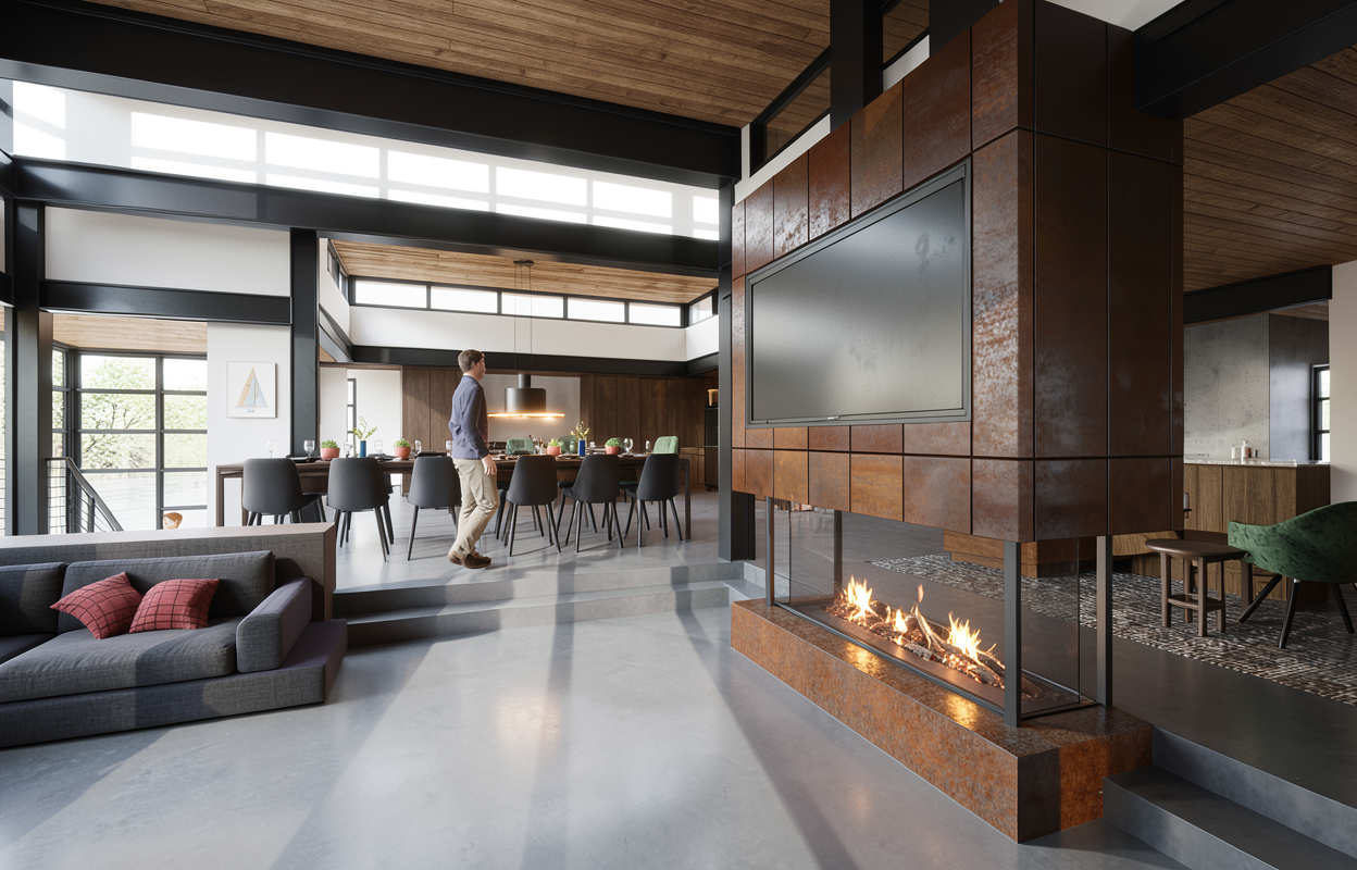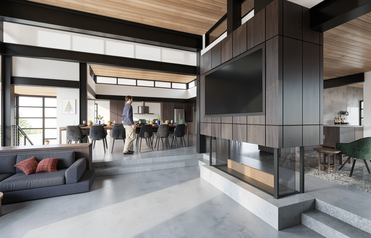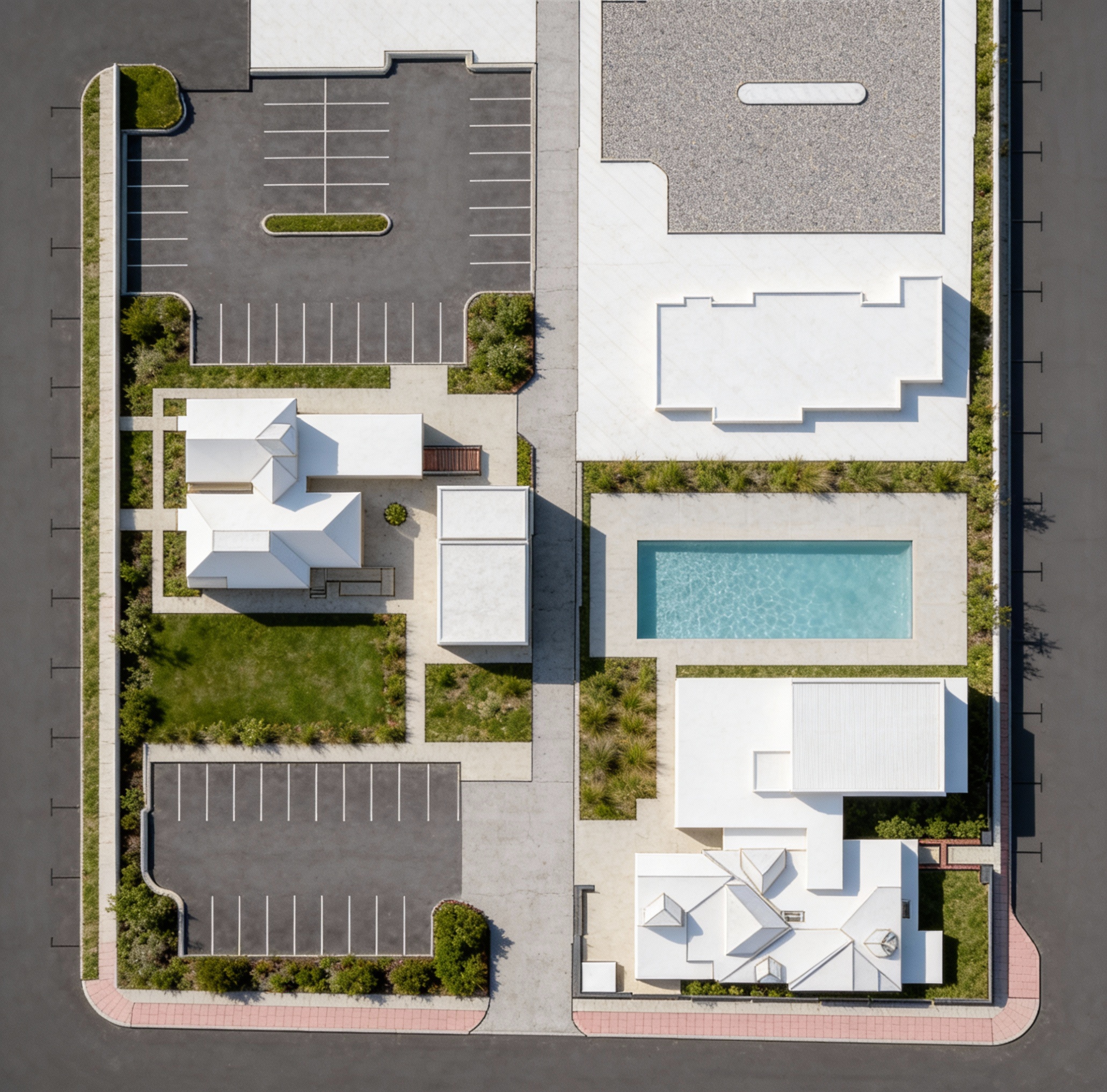 architectural site plan illustration in plan view clean minimal and diagrammatic with soft hand drawn line quality subtle sketch texture calm green oriented color palette simplified landscape elements trees and restrained contrast professional quiet competition ready graphic make the roofs dark put cars in some parking spots