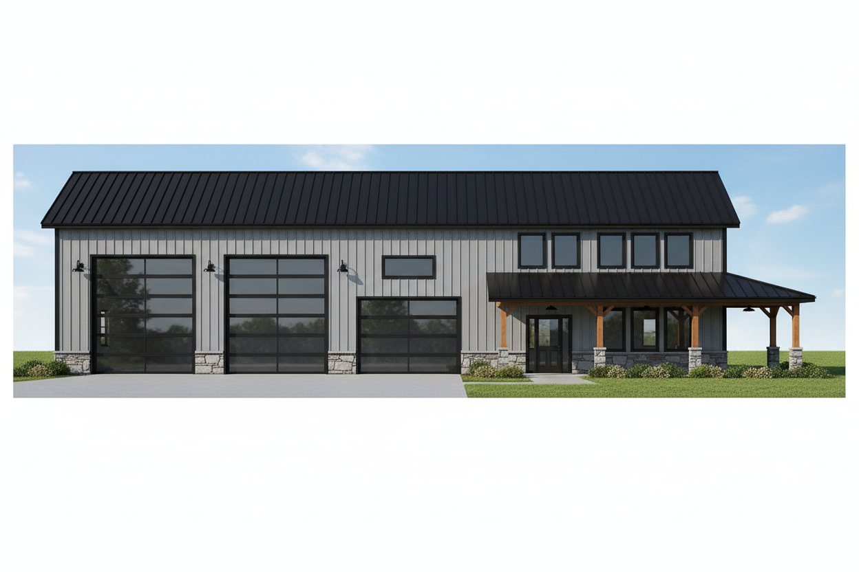 photo realistic straight on elevation view black metal roof and trim shiny gray metal siding with black window trim and black corner trim medium stained wood columns gray 2 toned rock wainscot and column bases black framed windows