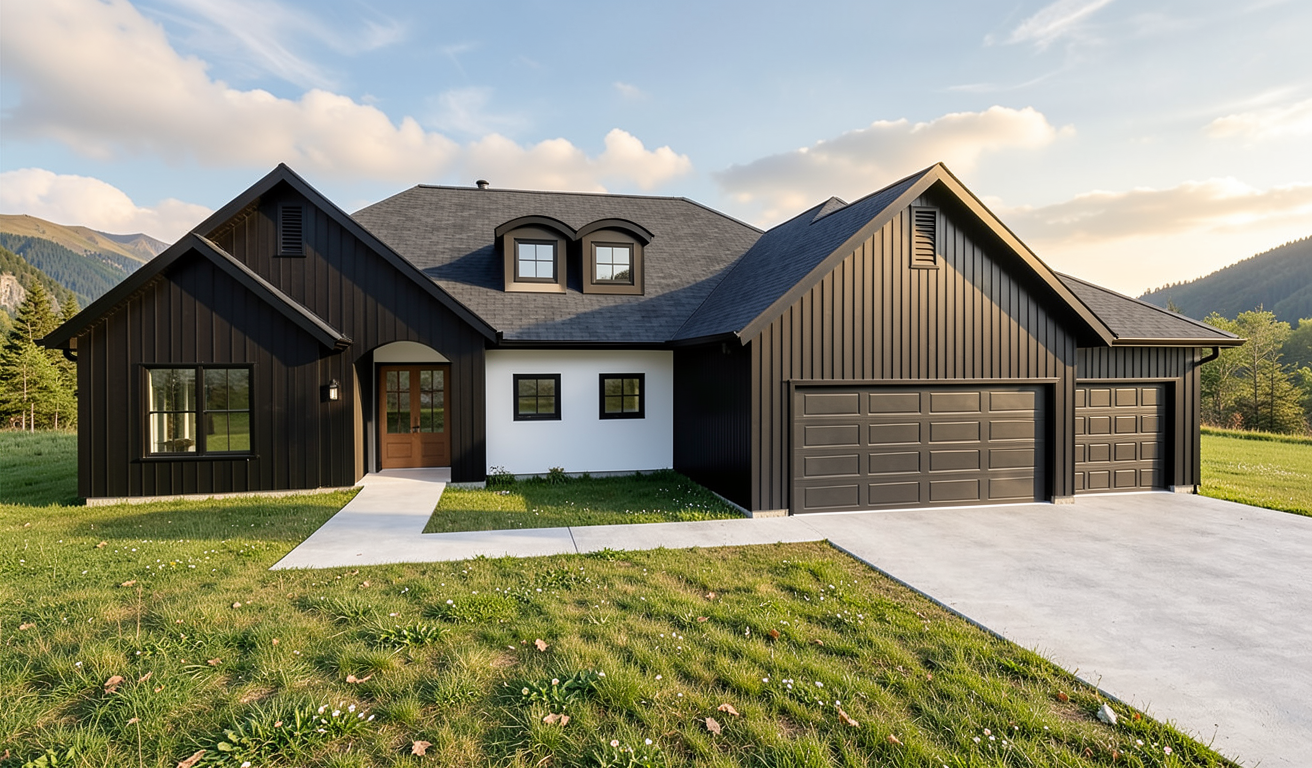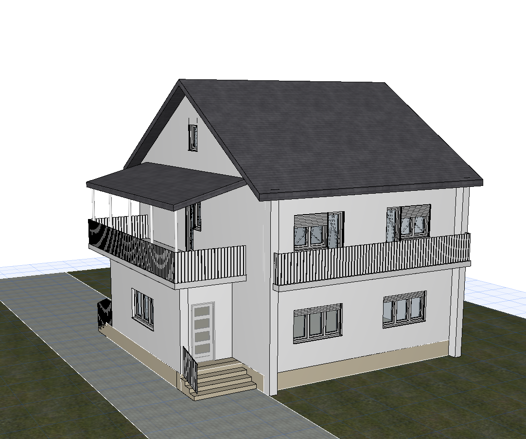 photorealistic architectural render of an existing two story family house strictly preserving the original building shape roof geometry balconies window placement and proportions as in the reference model exterior redesign with soft beige facade tones in a refined elegant palette combined with selected accent areas finished in light natural brick slip brick cladding anthracite roof tiles white window and door frames and white wooden railings on balconies and exterior stairs clean timeless european residential architecture with a subtle luxury character high quality materials realistic textures natural daylight soft shadows neutral surroundings ultra detailed and professional architectural visualization