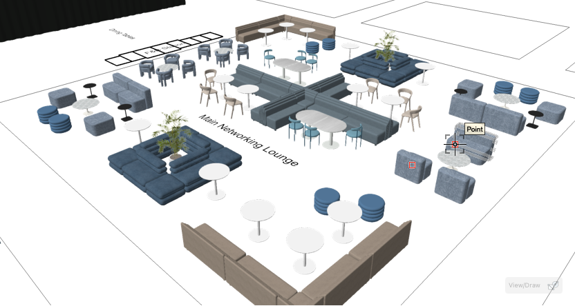 tables white centre lounges a little bit more light blue carpet in dark blue delete text corner lounge tan colour add people some small library lamps on tables add son bookshelves with books and plants