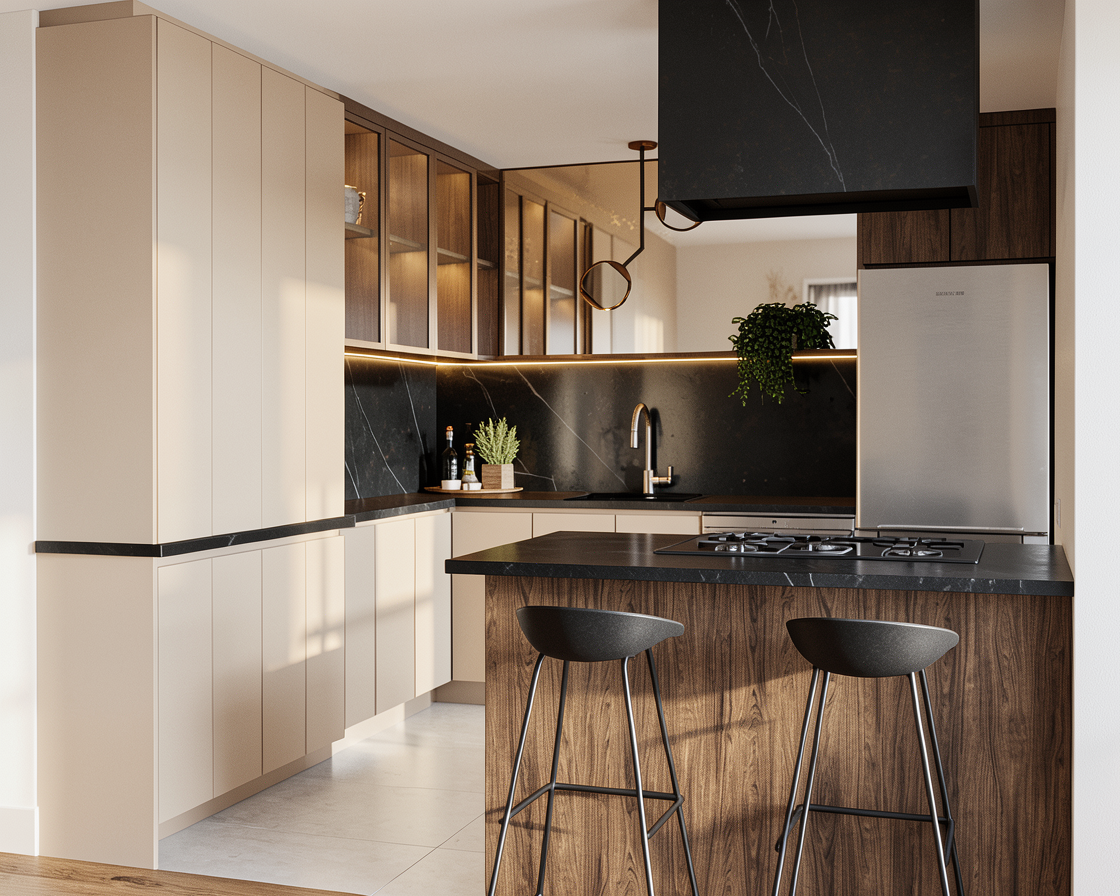 terrazza con divano in tessuto bianco caldo e cuscini sui toni del blu scuro verde tavoli e tavolini in legno teak e cucina con piano di lavoro fianchi e mensola in gr s effetto pietra gli sgabelli e gli elettrodomestici della cucina sono cromati la mensola della cucina ha una strip led sotto che illumina il piano di lavoro nella pergotenda sopra al divano c una strip led incassata perimetrale accesa attorno alla vasca idromassaggio ci sono delle siepi e un parapetto in vetro davanti alla vasca idromassaggio ci sono dei cuscinoni blu appoggiati metti uno sfondo con case chiome di alberi e colline in lontananza al tramonto metti qualche oggetto per ambiente conviviale esterno