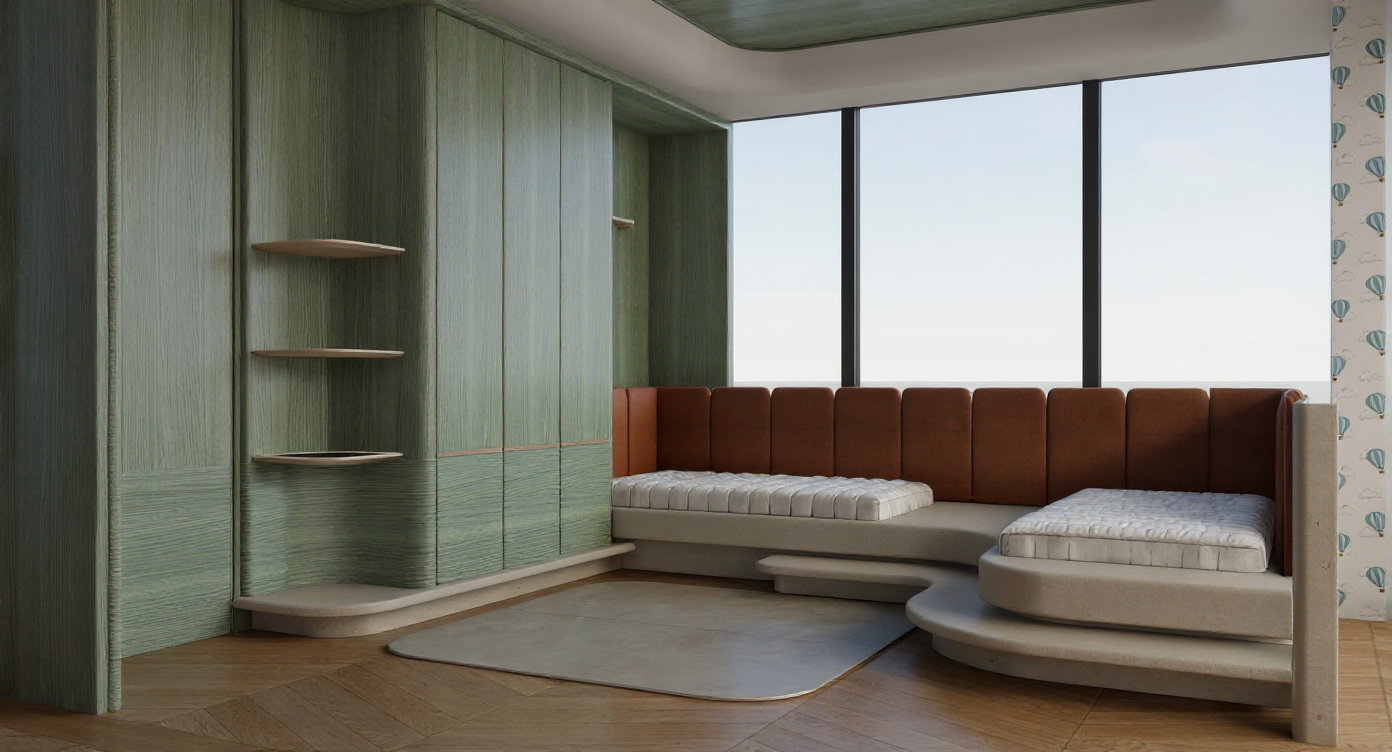 add day curtain at the window and make the green wood lighten a bit add display vase on shelves