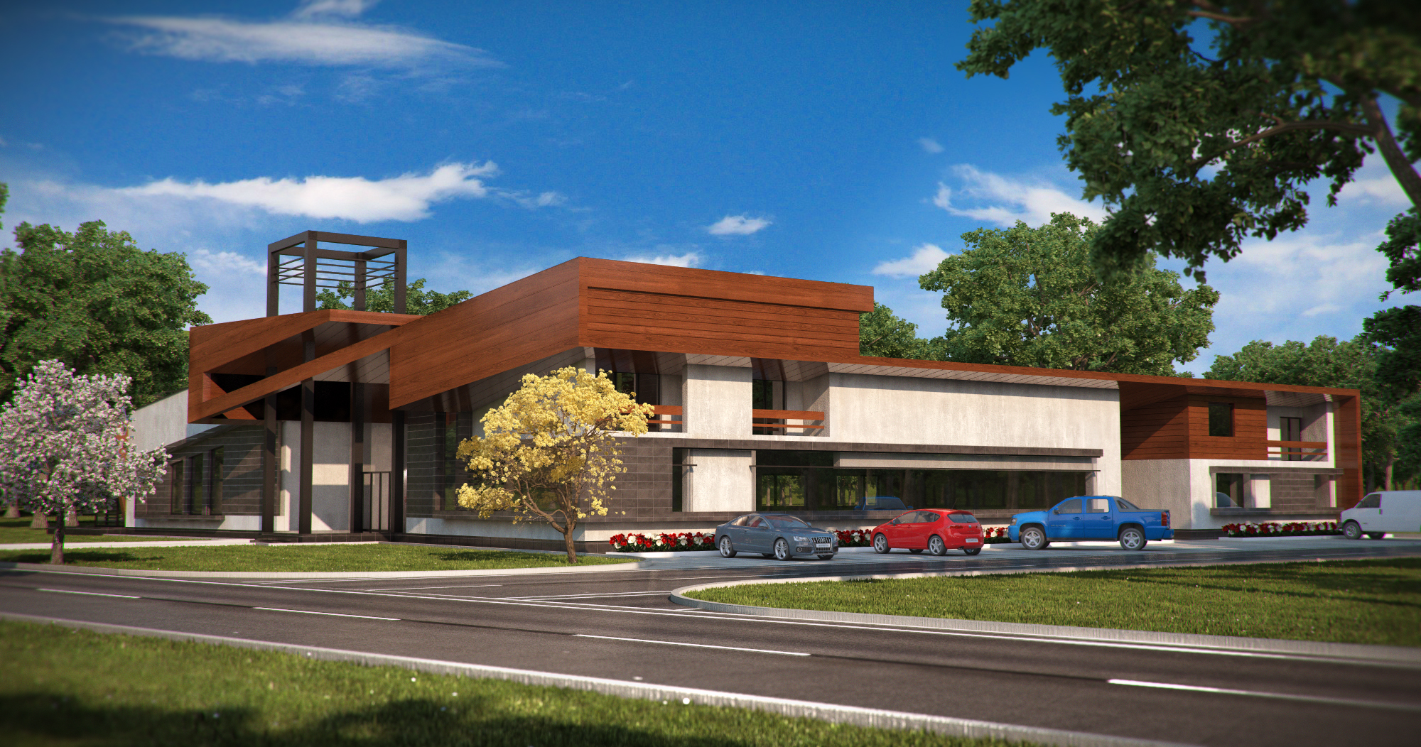 convert the image into a realistic outdoor photograph with professional architectural aesthetic maintaining 100 of the geometry and layout applying authentic materials afternoon warm lighting with soft shadows and a sharp photorealistic result use real images of people instead of the ones in the original image add landscape design behind the building do not change material colors